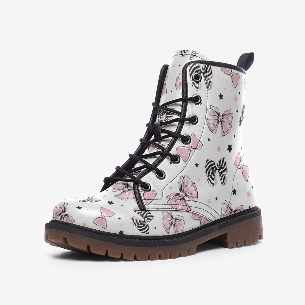Pink & Black Bow Print Faux Leather Boots – Girly Combat Style with Retro Edge