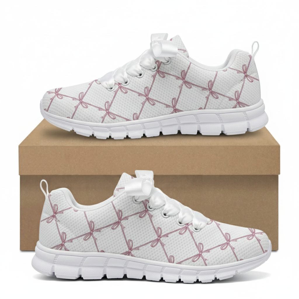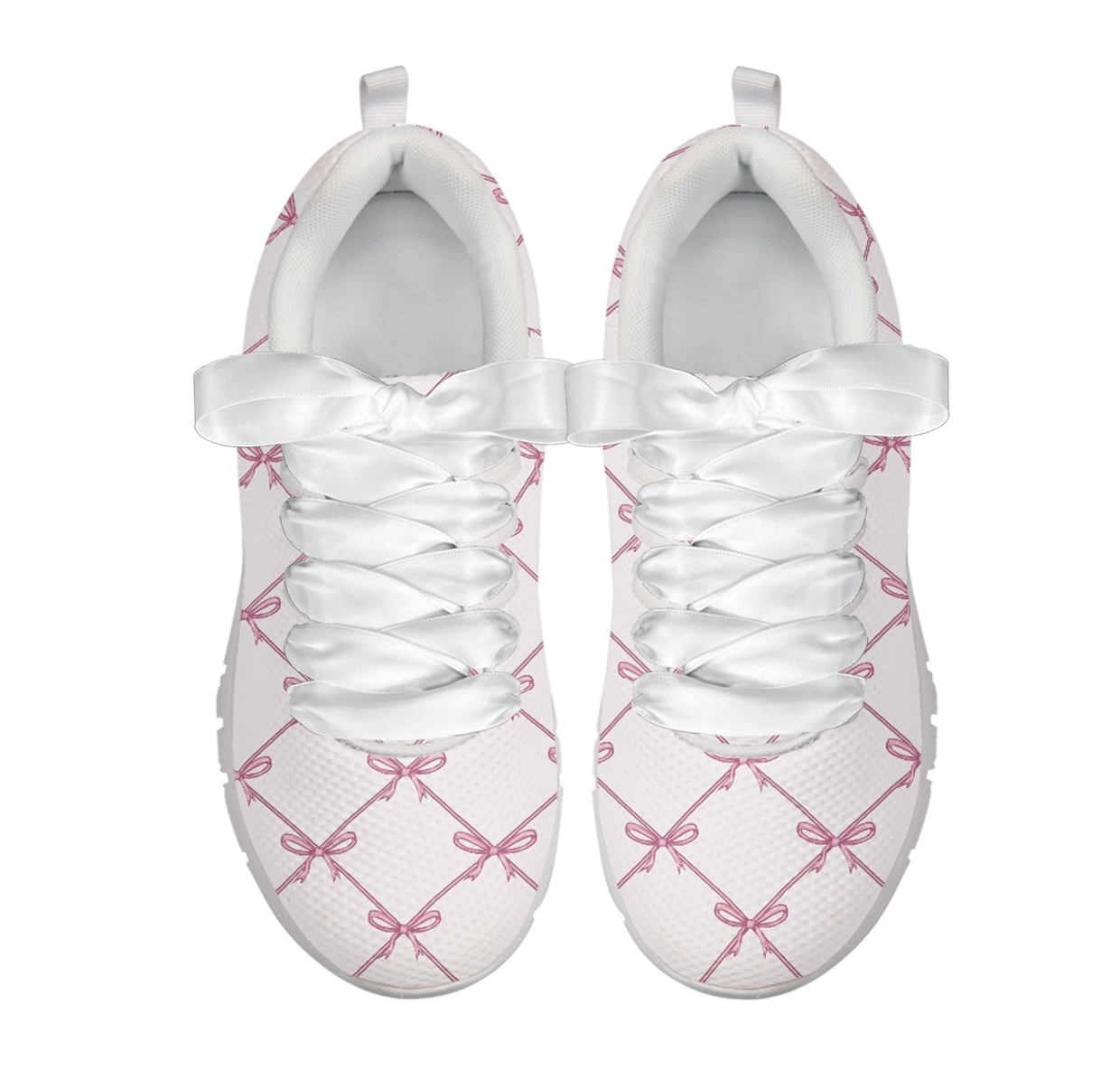 Pink Bow Pattern Classic Walking Shoes With Satin Ribbon Laces