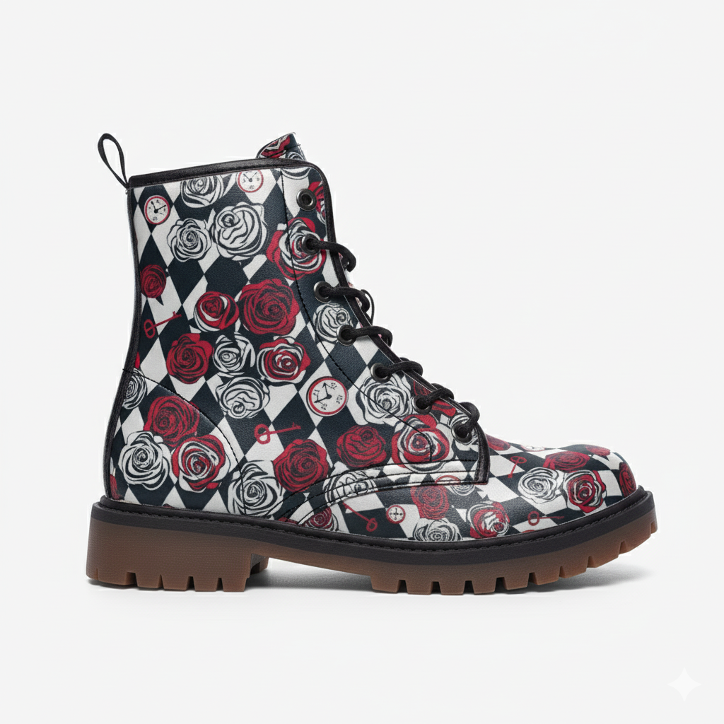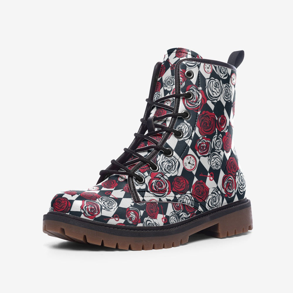 Red & Black Rose Checkered Print Faux Leather Boots – Gothic Wonderland Style