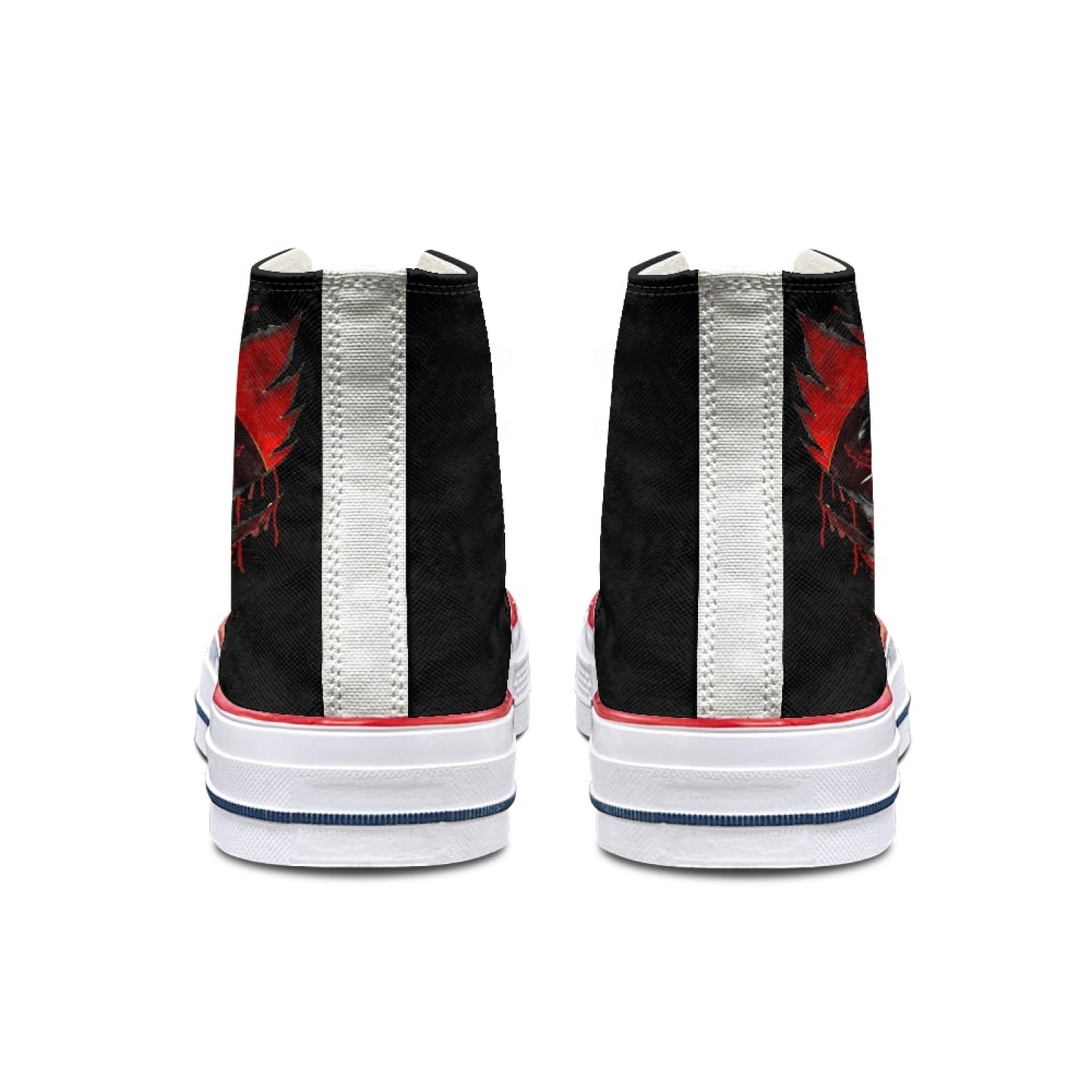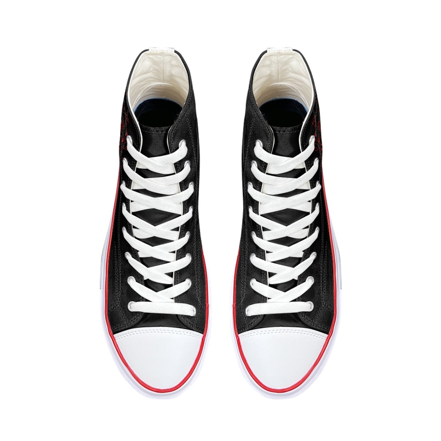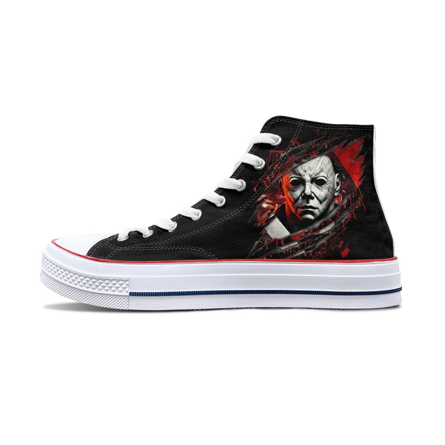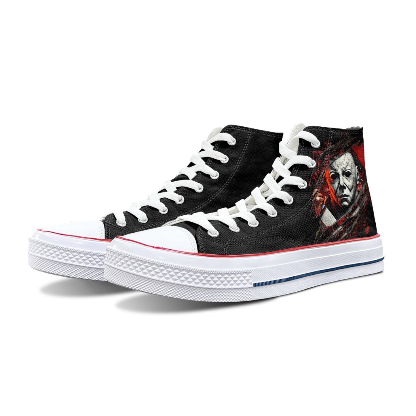 These high-tops are made for the fans who live for the thrill of spooky season — all year long. Featuring a striking horror-inspired portrait with red slash detailing on deep black canvas, they’re your new go-to sneakers for statement-making street style.