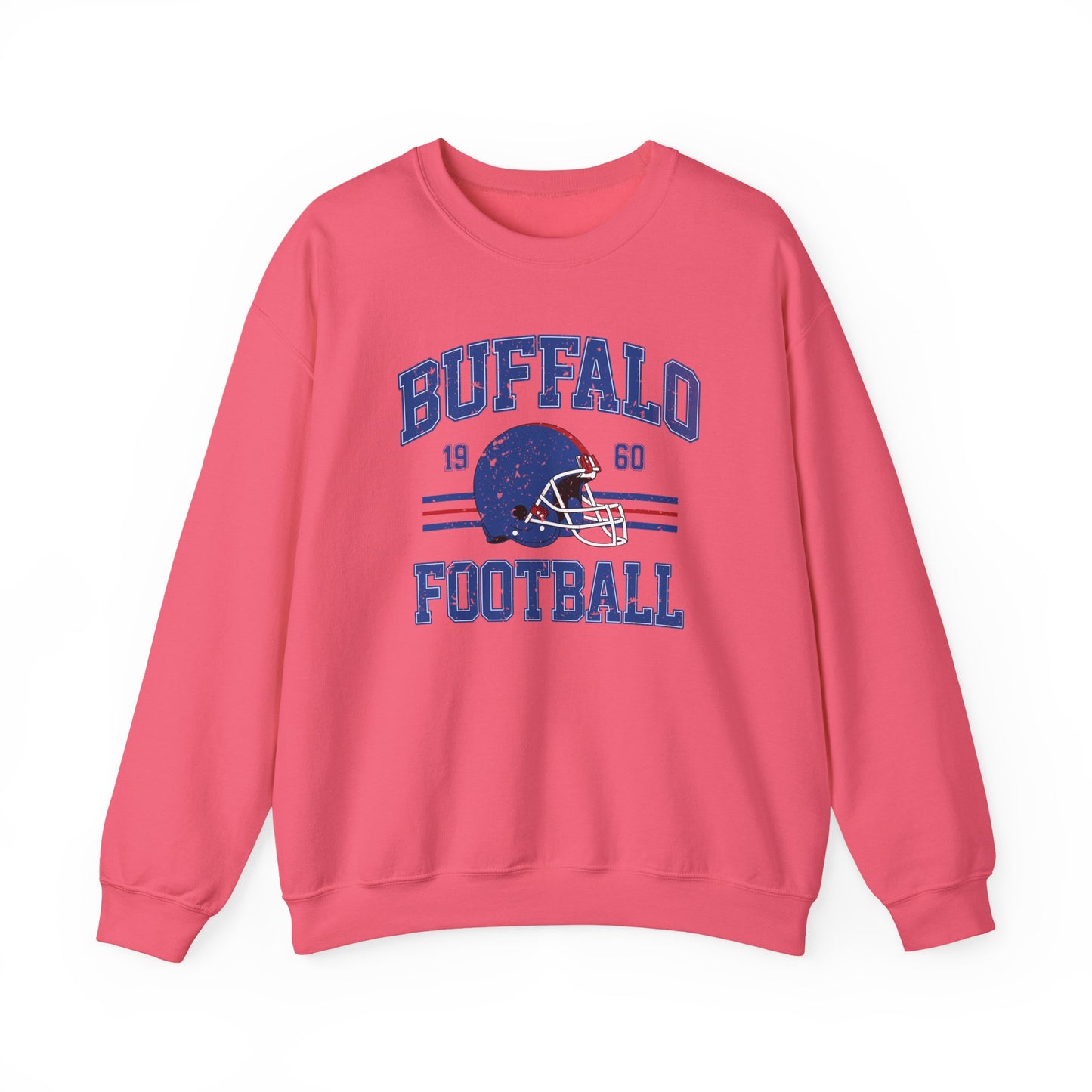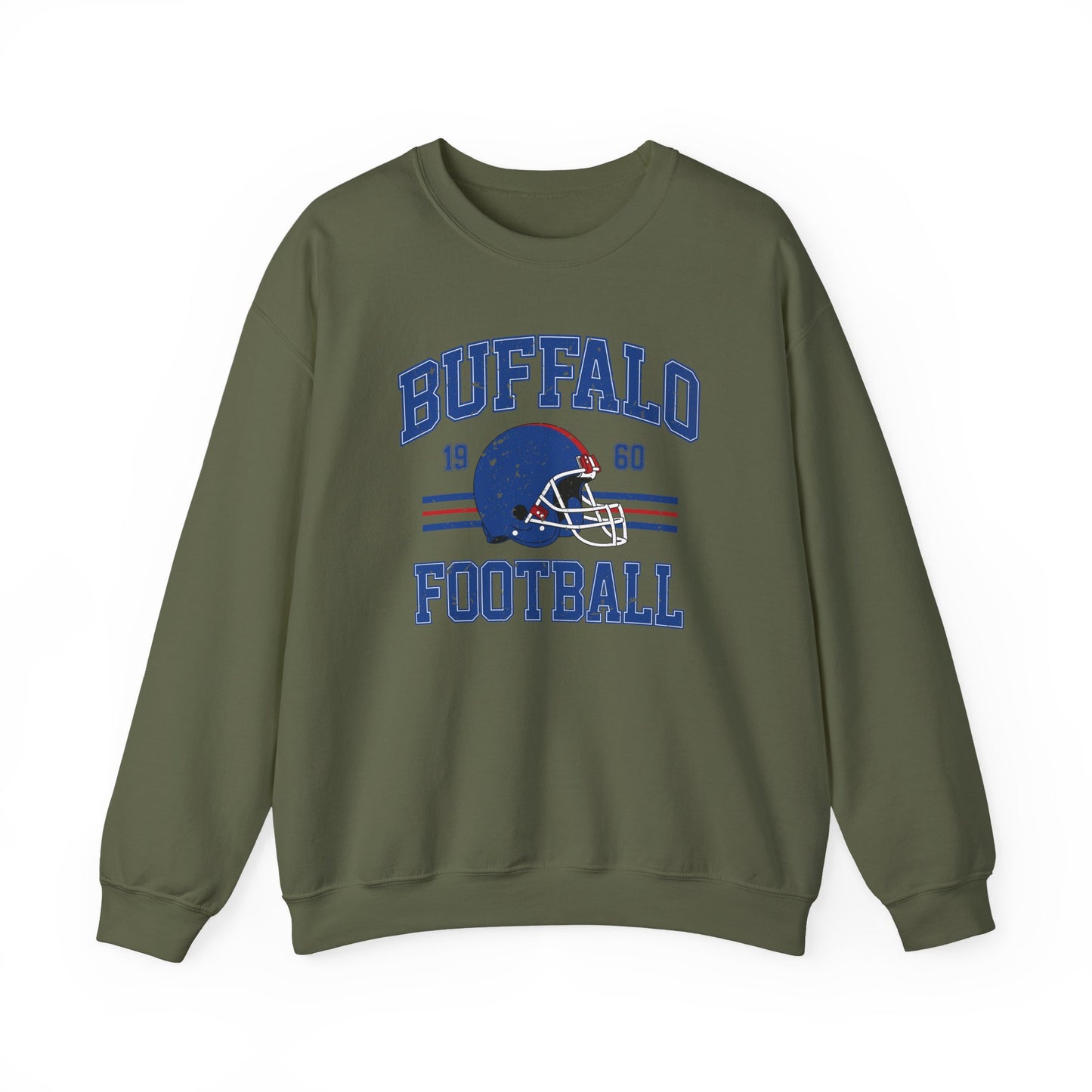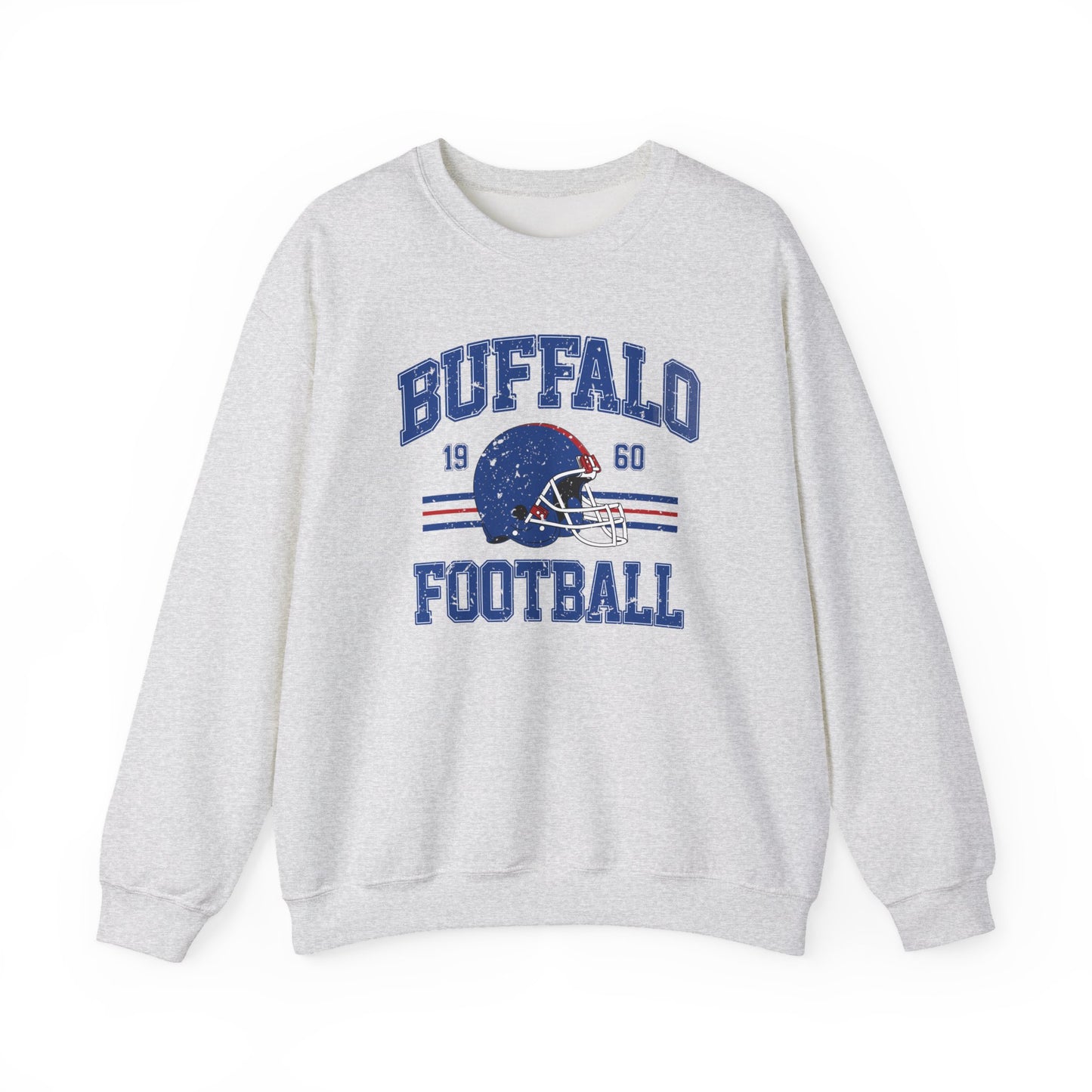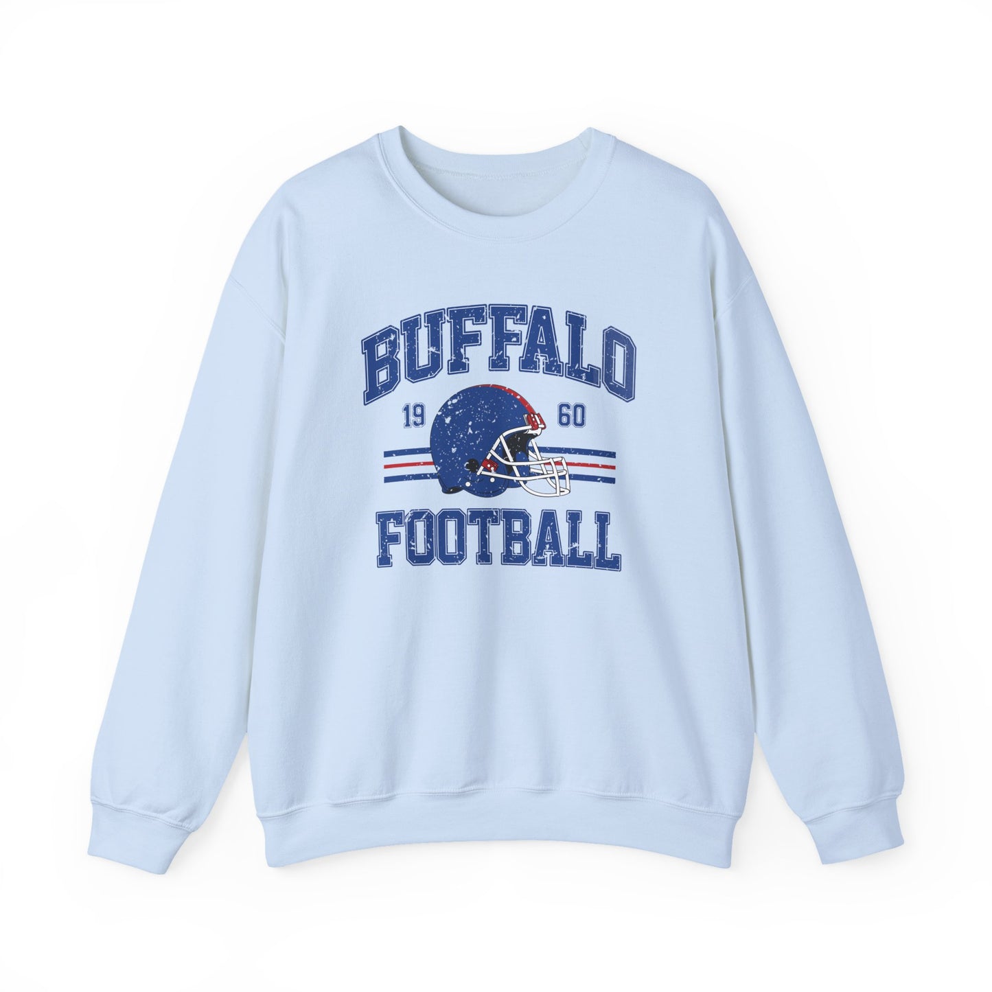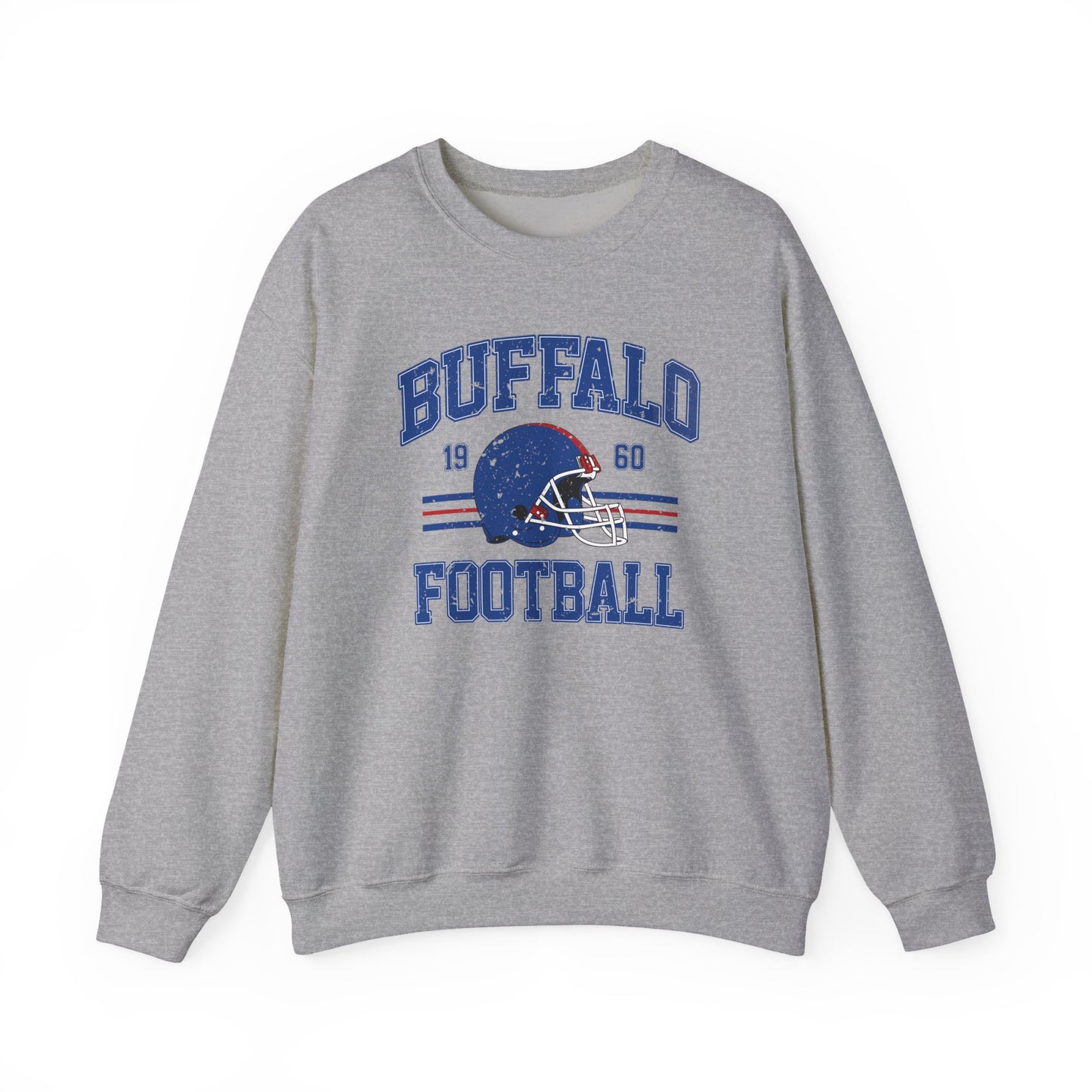 Cheer on your team in timeless style with our Buffalo Football Gildan 18000 Crewneck Sweatshirt — a perfect blend of classic sports energy and cozy comfort. The bold blue helmet graphic, retro stripes, and “1960” detailing bring a nostalgic vintage vibe that any fan will love.