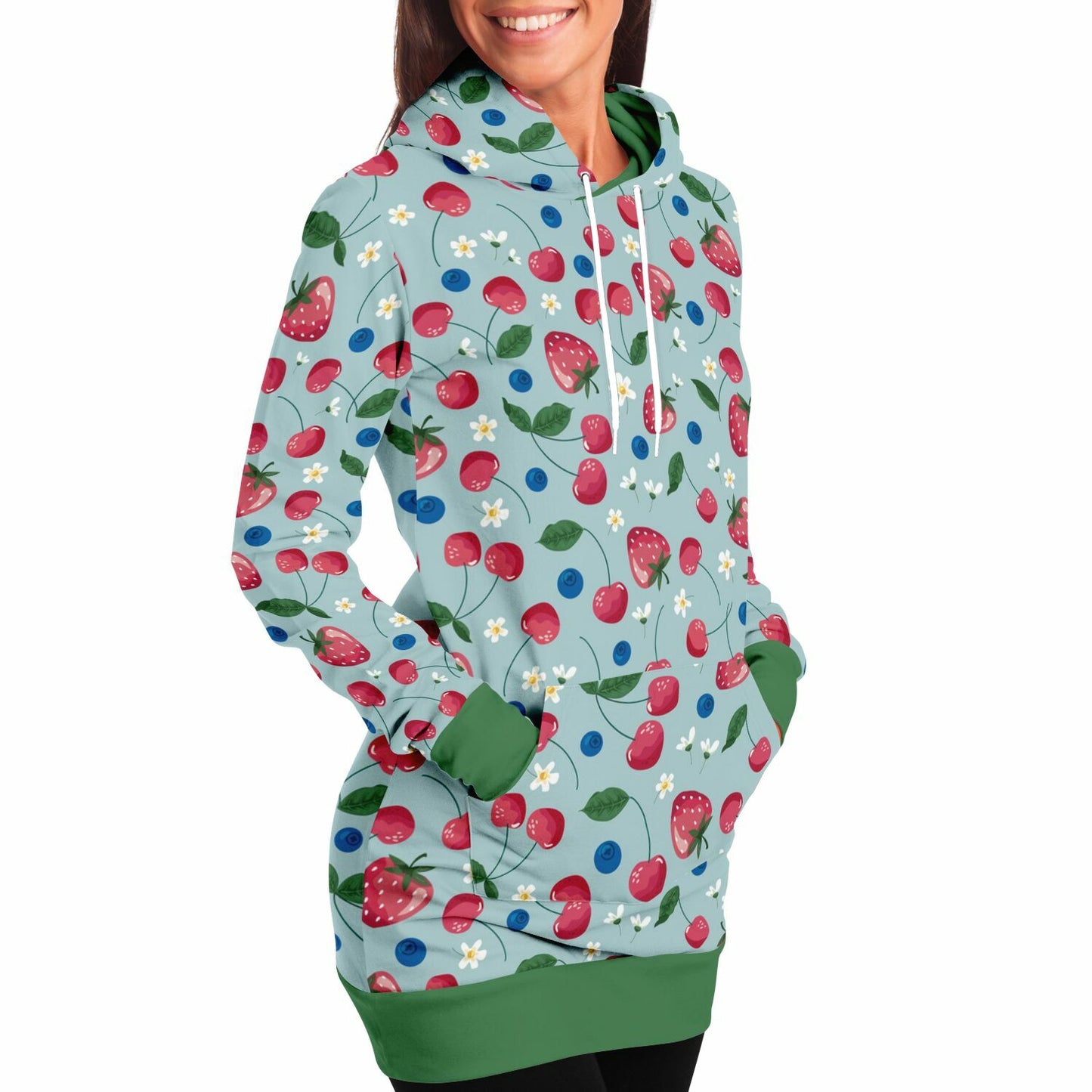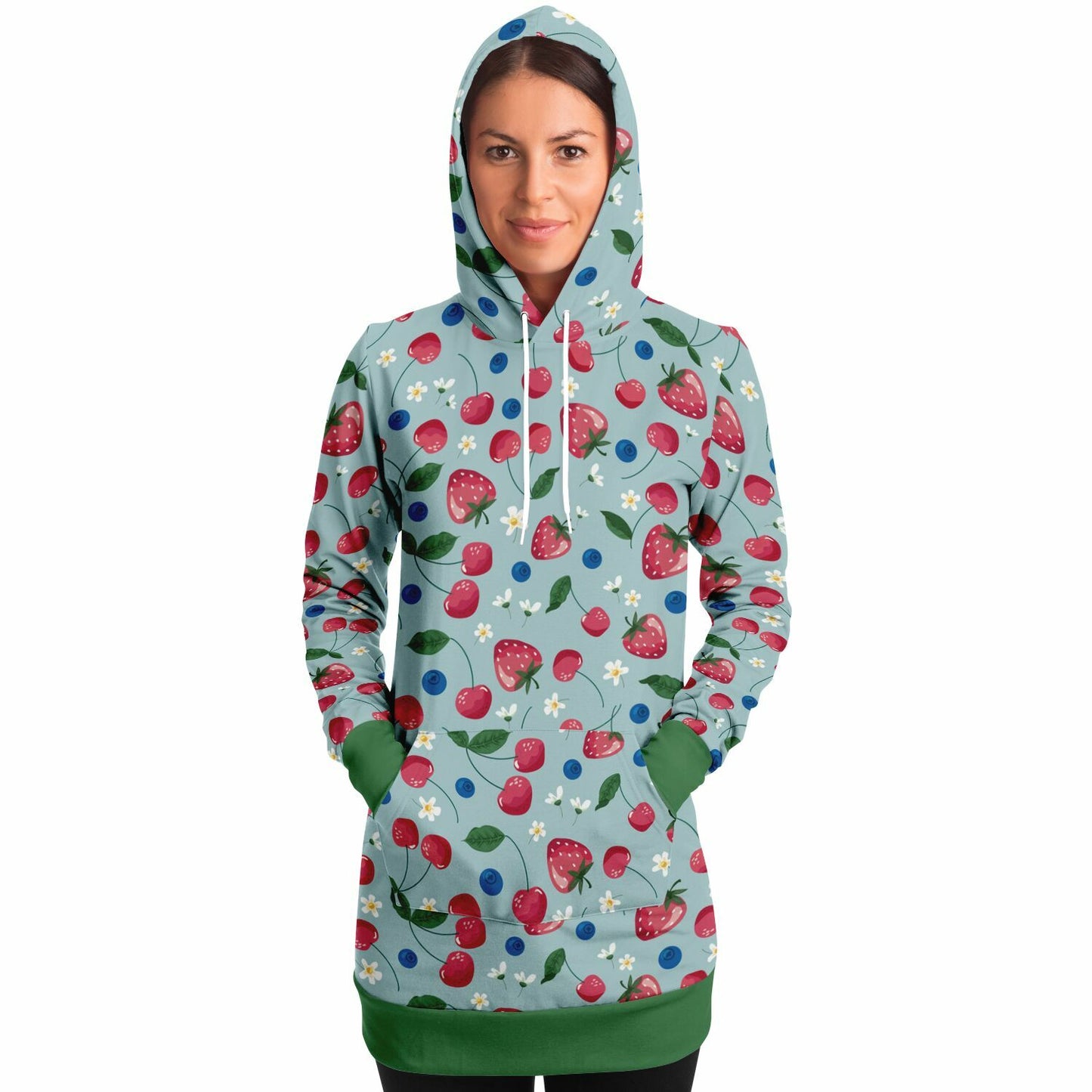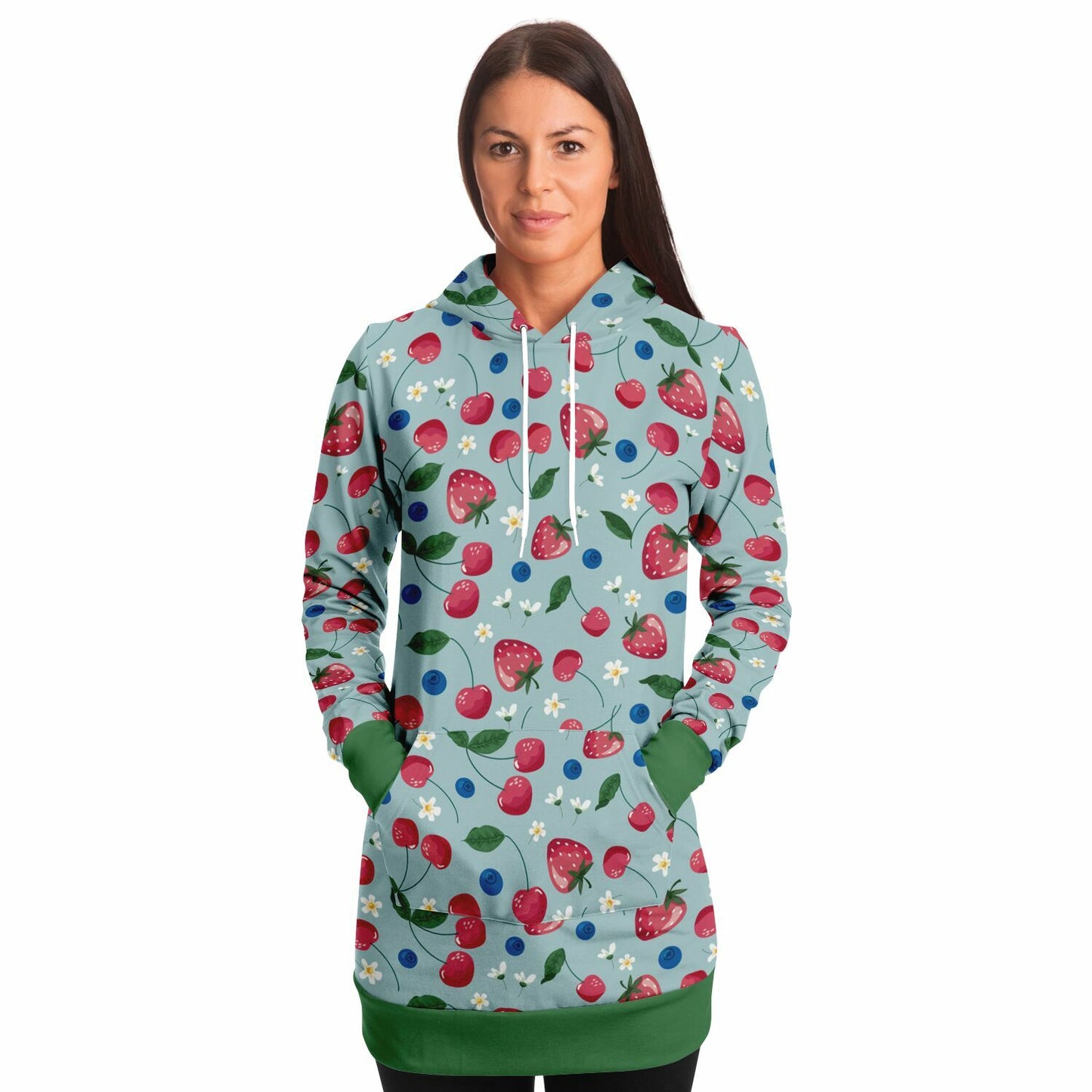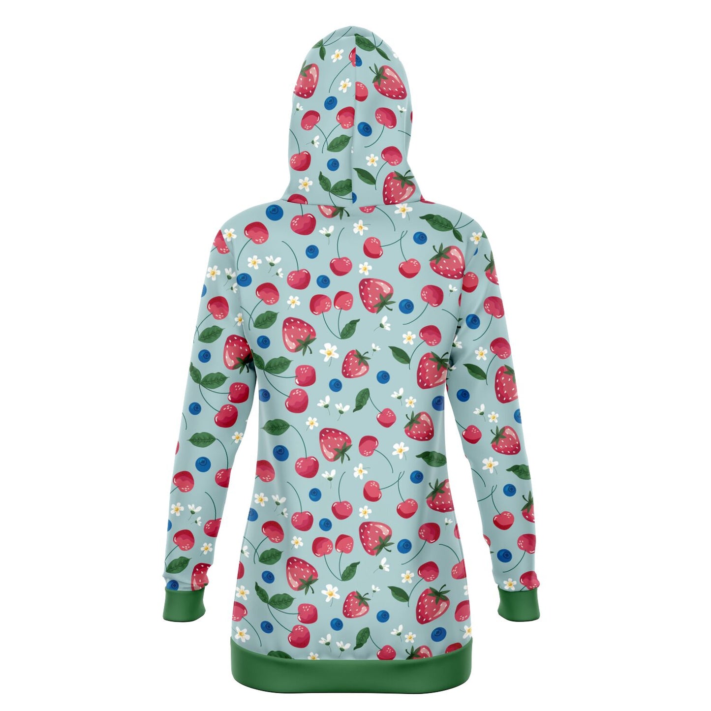 Playful, cozy, and effortlessly stylish 🍒🍓🫐✨ This Berry Blossom Hoodie Dress is the perfect mix of comfort and charm. Featuring a cheerful all-over fruit print with cherries, strawberries, blueberries, and tiny white blossoms, it’s like wearing a little piece of summertime sweetness wherever you go.