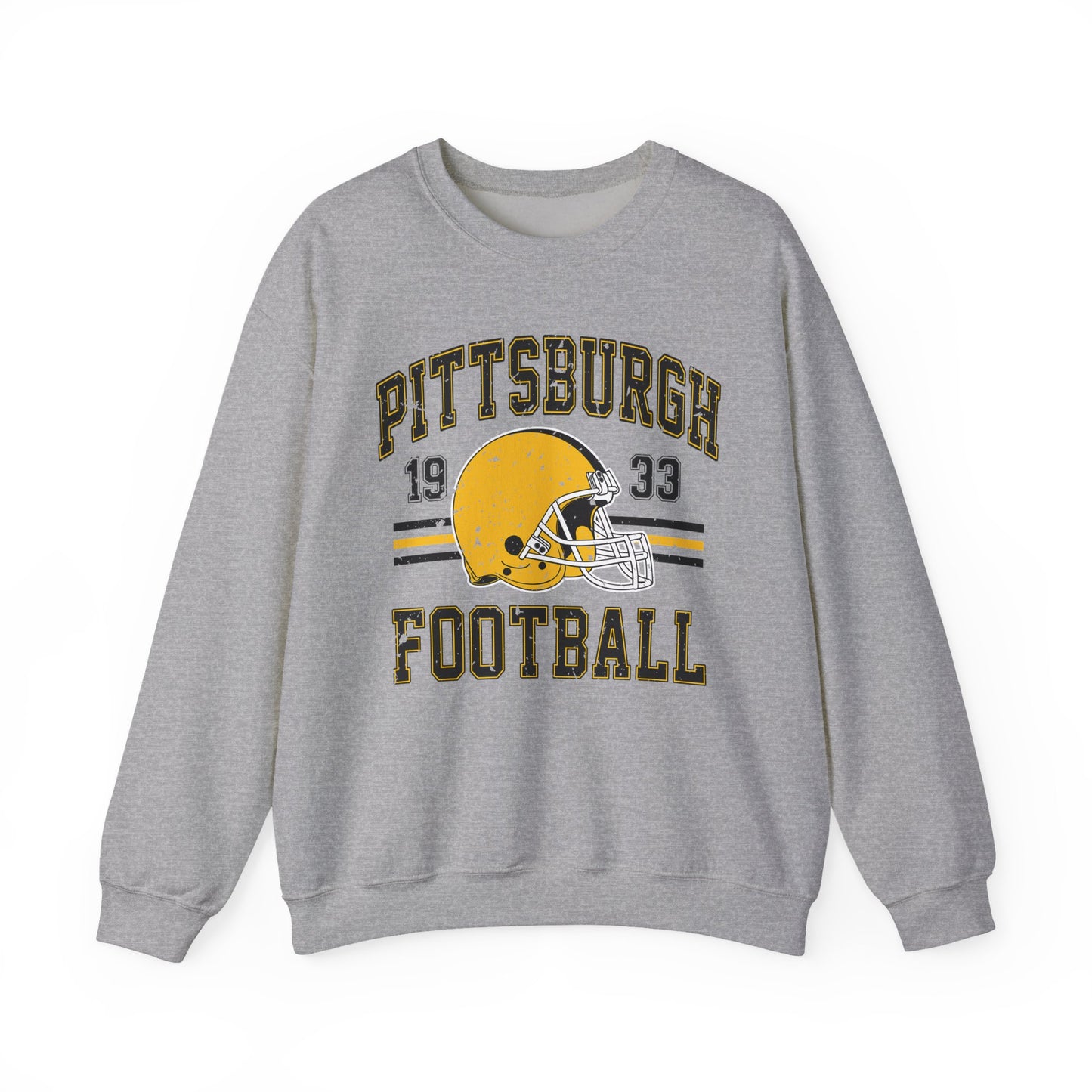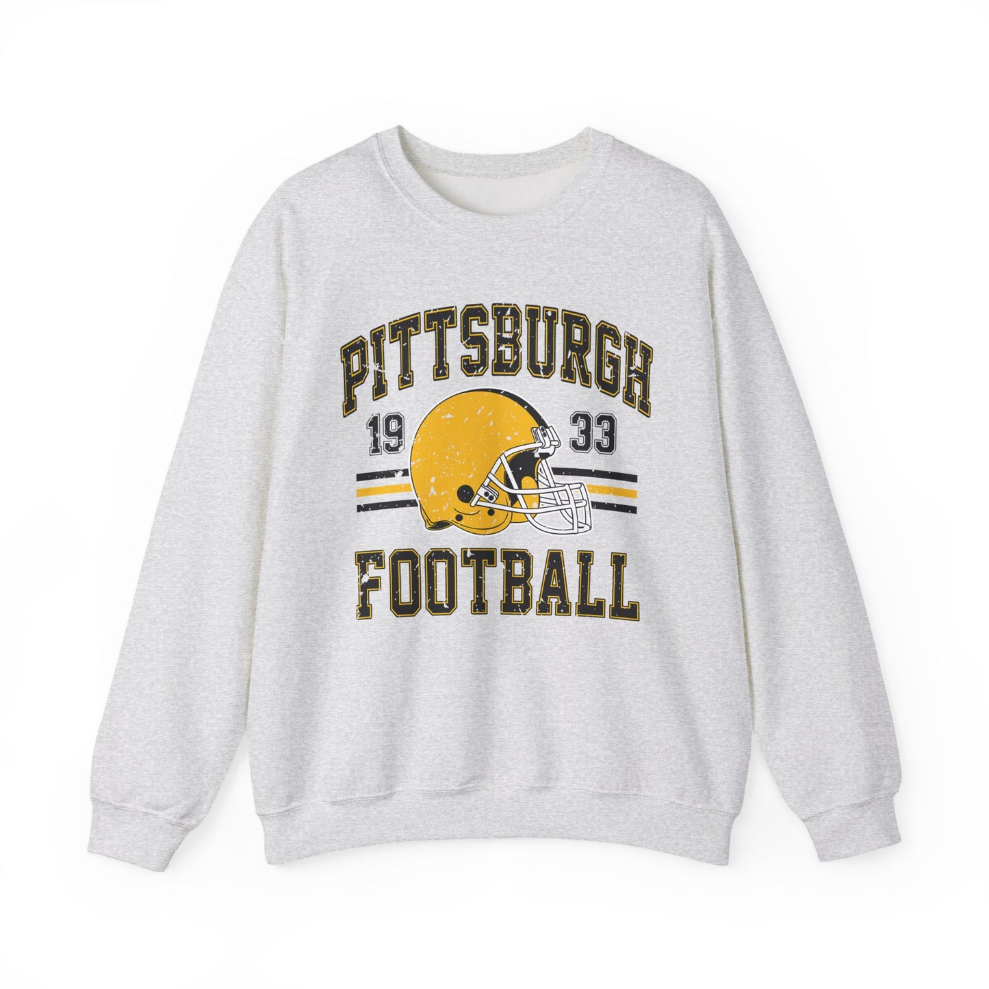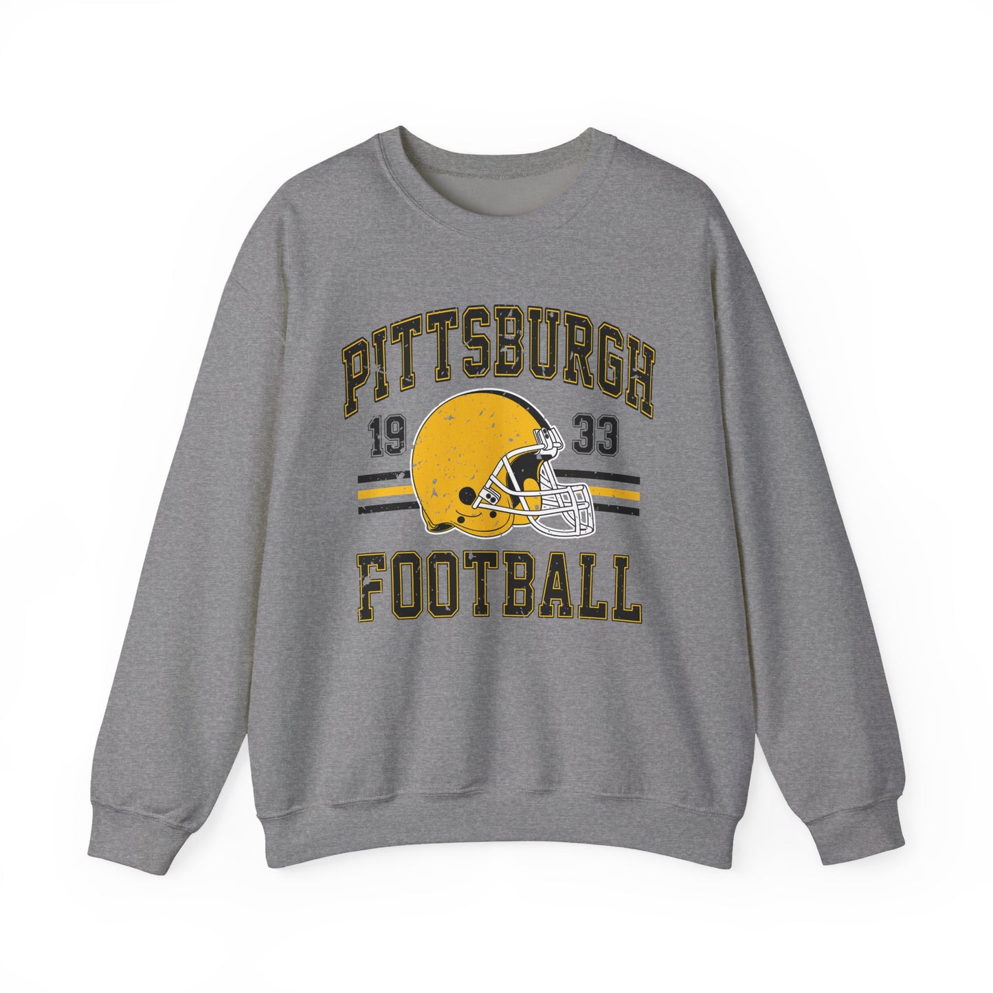 Cheer on your favorite team in style with our Pittsburgh Football Crewneck! Designed with striking black and gold lettering and a distressed helmet graphic, this sweatshirt brings vintage football vibes with modern comfort. Perfect for layering over tees on crisp fall days, it’s made with the classic Gildan Heavy Blend for softness, warmth, and durability.