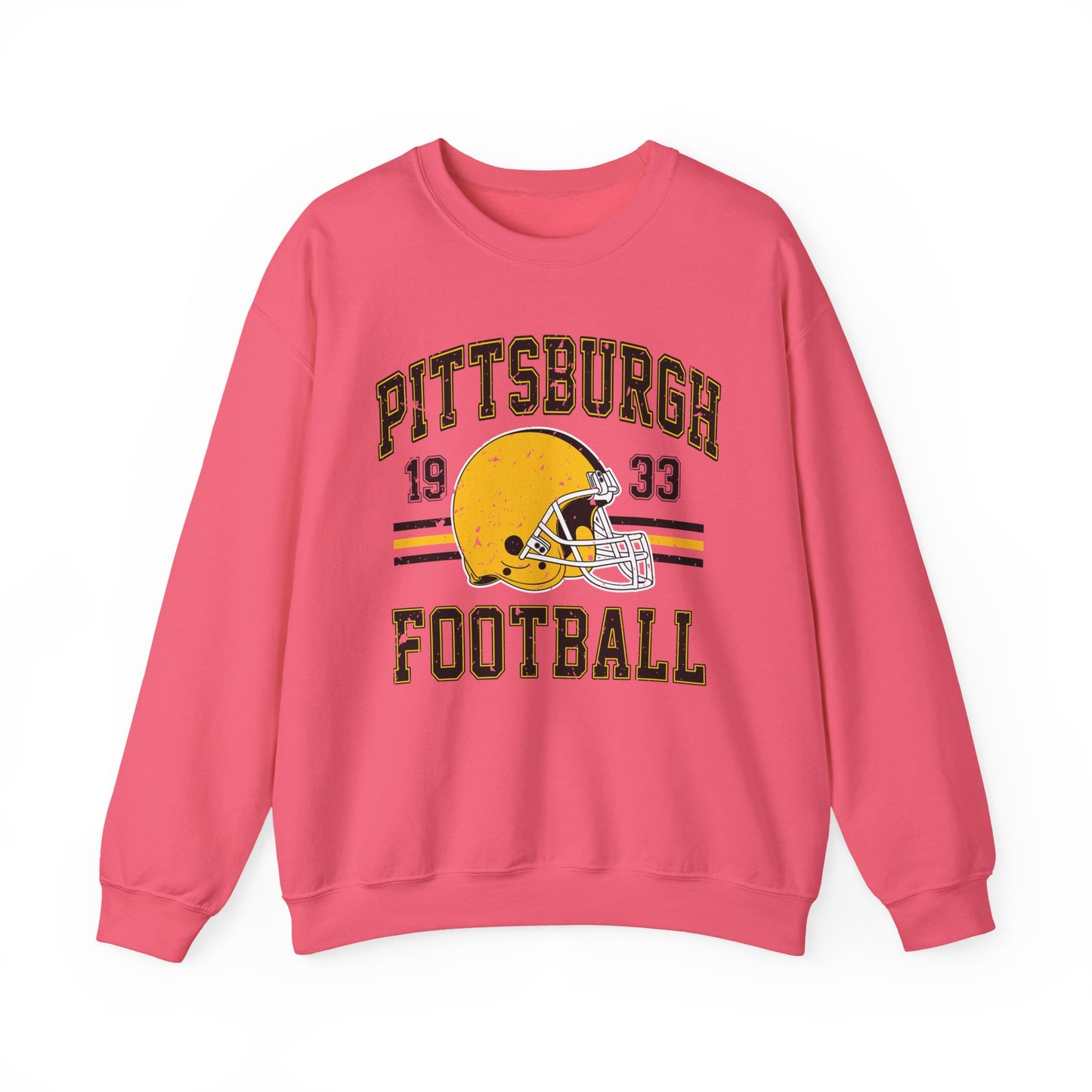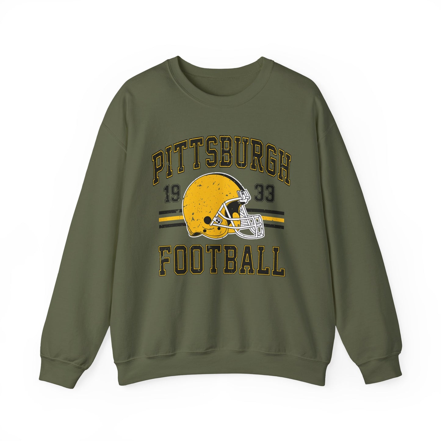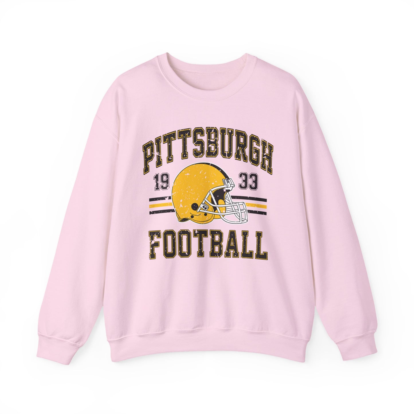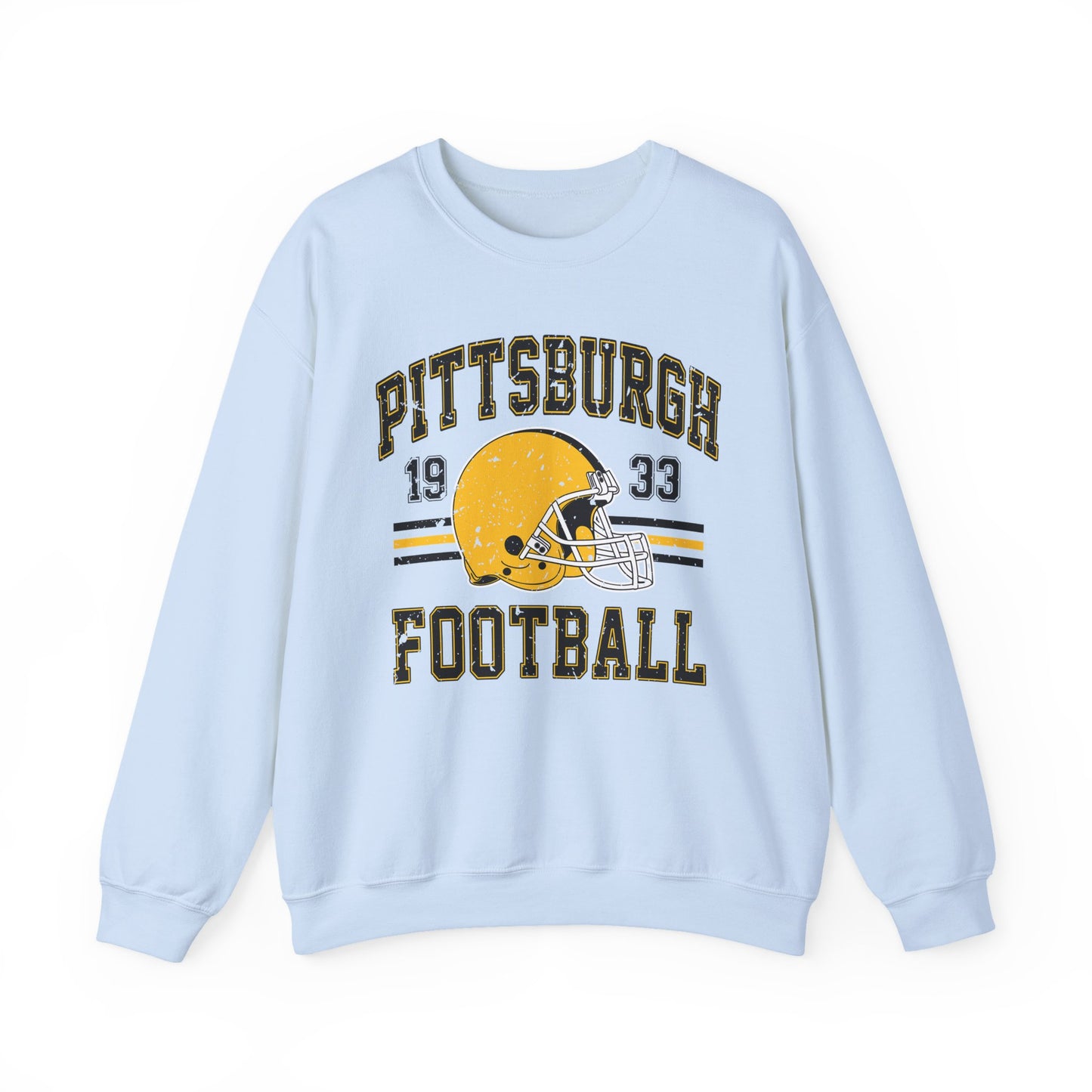 Cheer on your favorite team in style with our Pittsburgh Football Crewneck! Designed with striking black and gold lettering and a distressed helmet graphic, this sweatshirt brings vintage football vibes with modern comfort. Perfect for layering over tees on crisp fall days, it’s made with the classic Gildan Heavy Blend for softness, warmth, and durability.