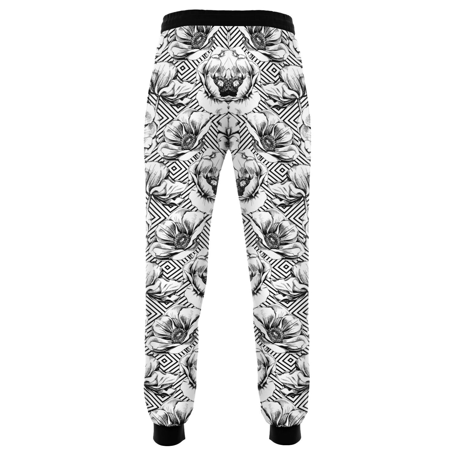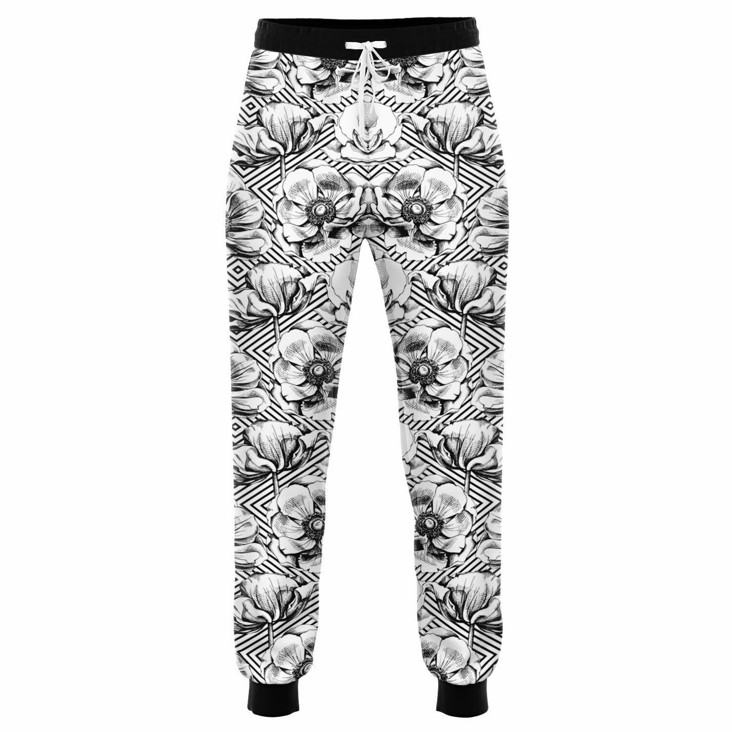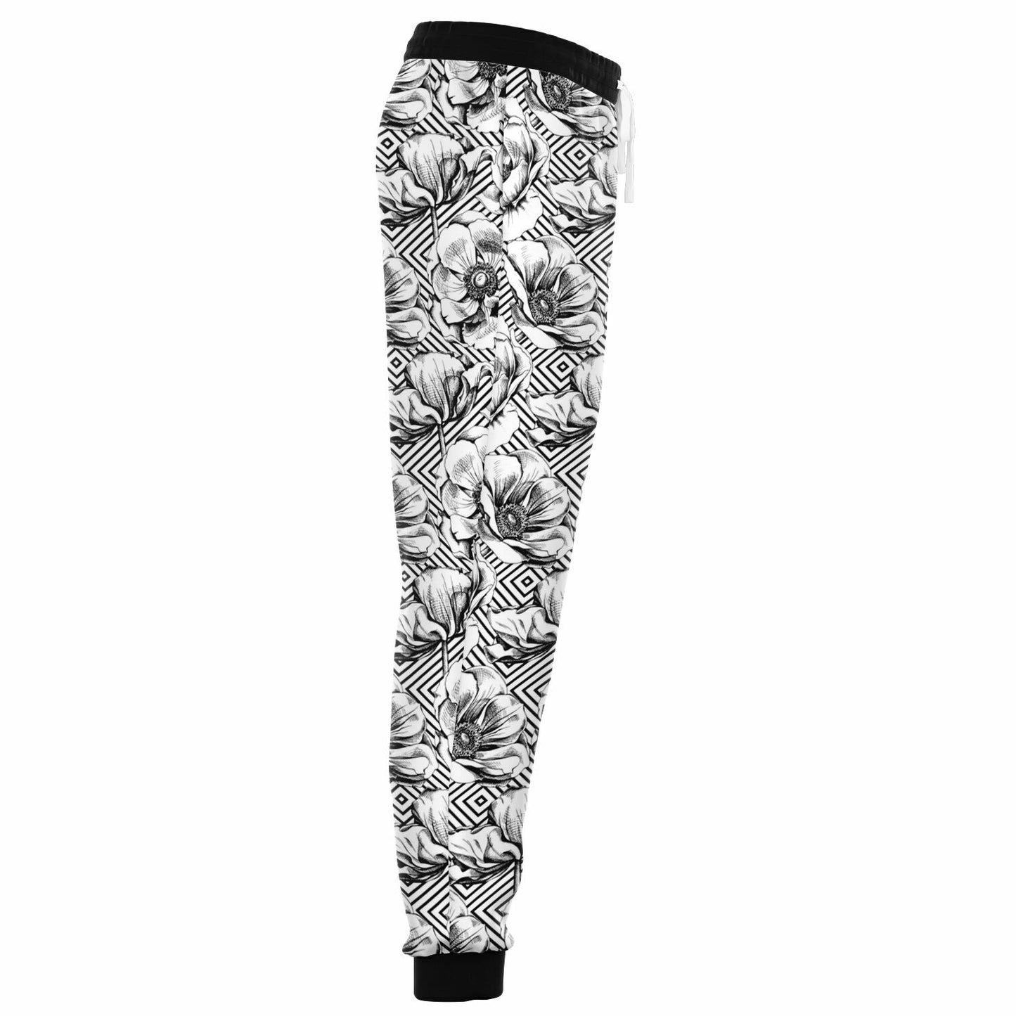 Black And White Geometric Floral Fleeced Joggers With Pockets