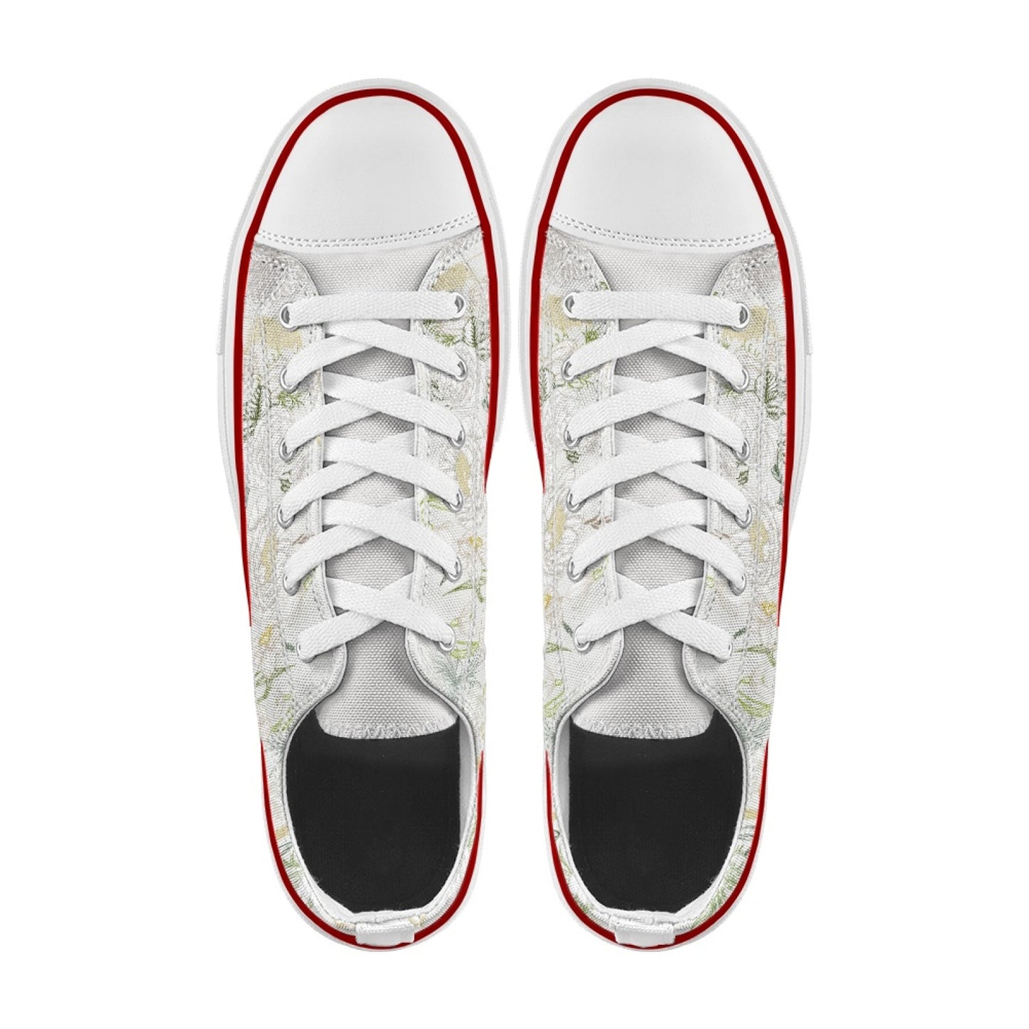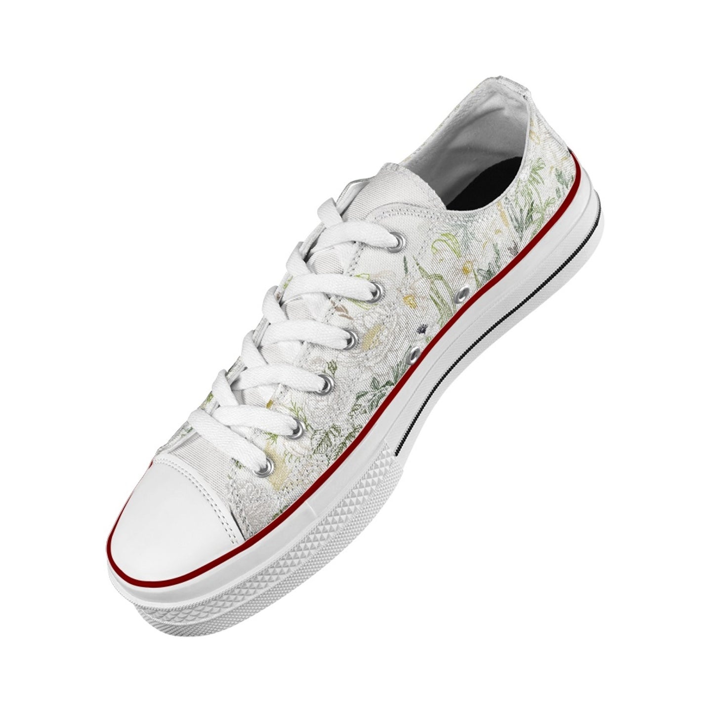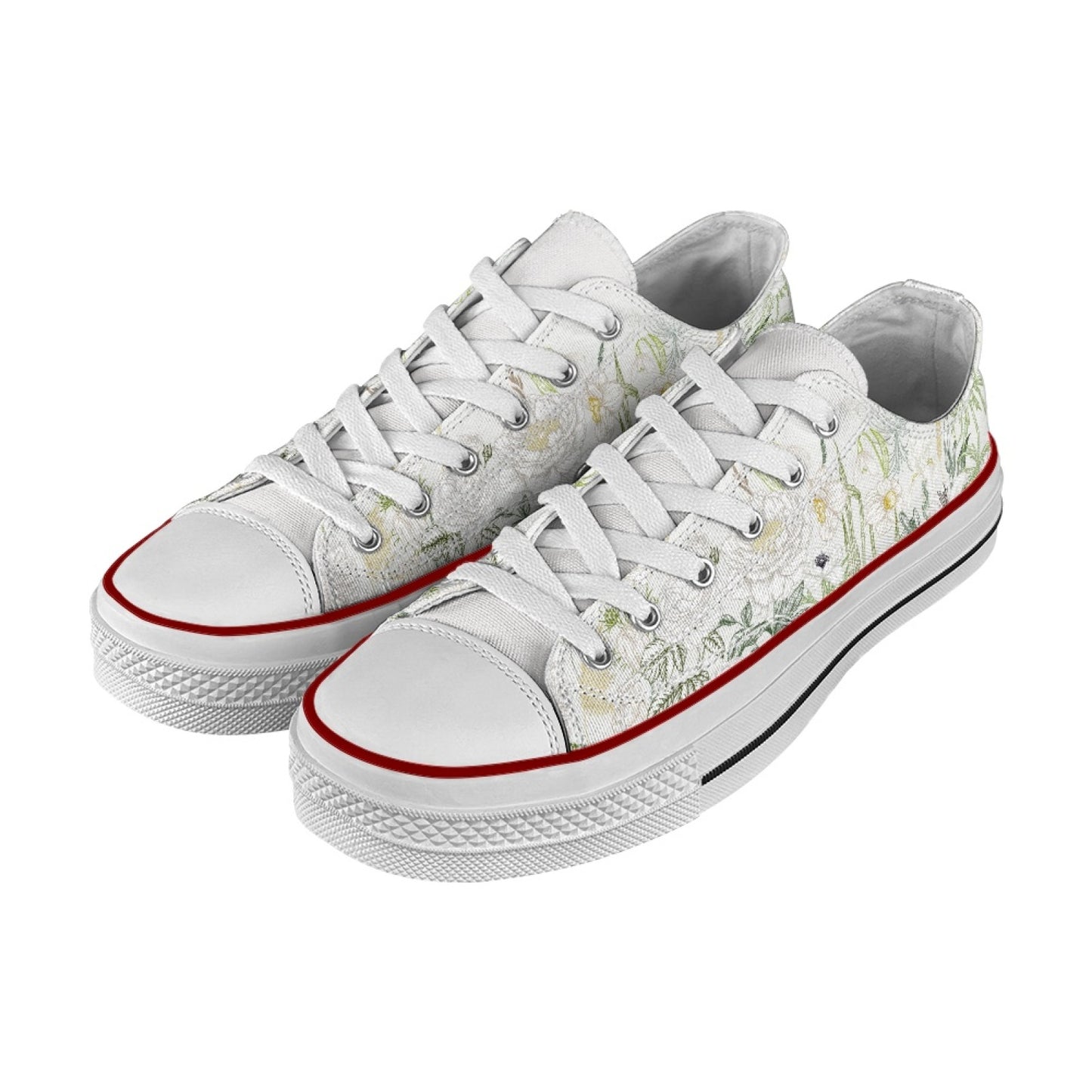 Step into comfort and charm with these dreamy floral lace-up low-tops! Featuring a soft canvas upper printed with delicate botanical sketches of blooming white peonies, wildflowers, and greenery, these sneakers are a wearable garden for your feet. Perfect for pairing with jeans, skirts, or dresses, they bring effortless style and a touch of nature to every outfit.