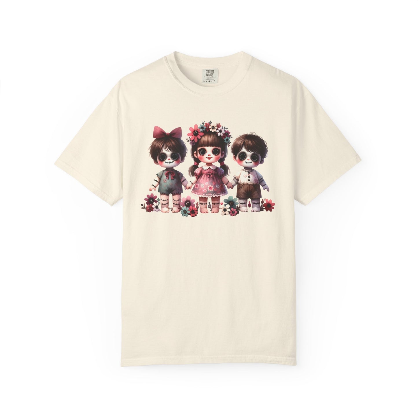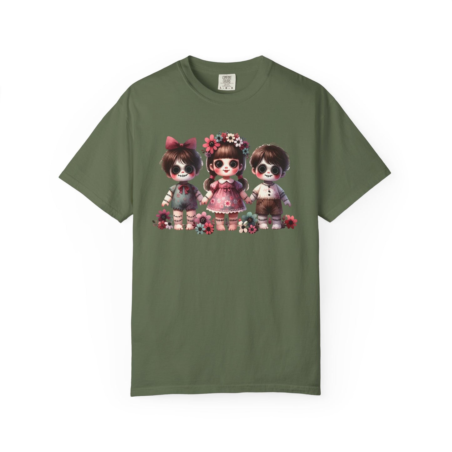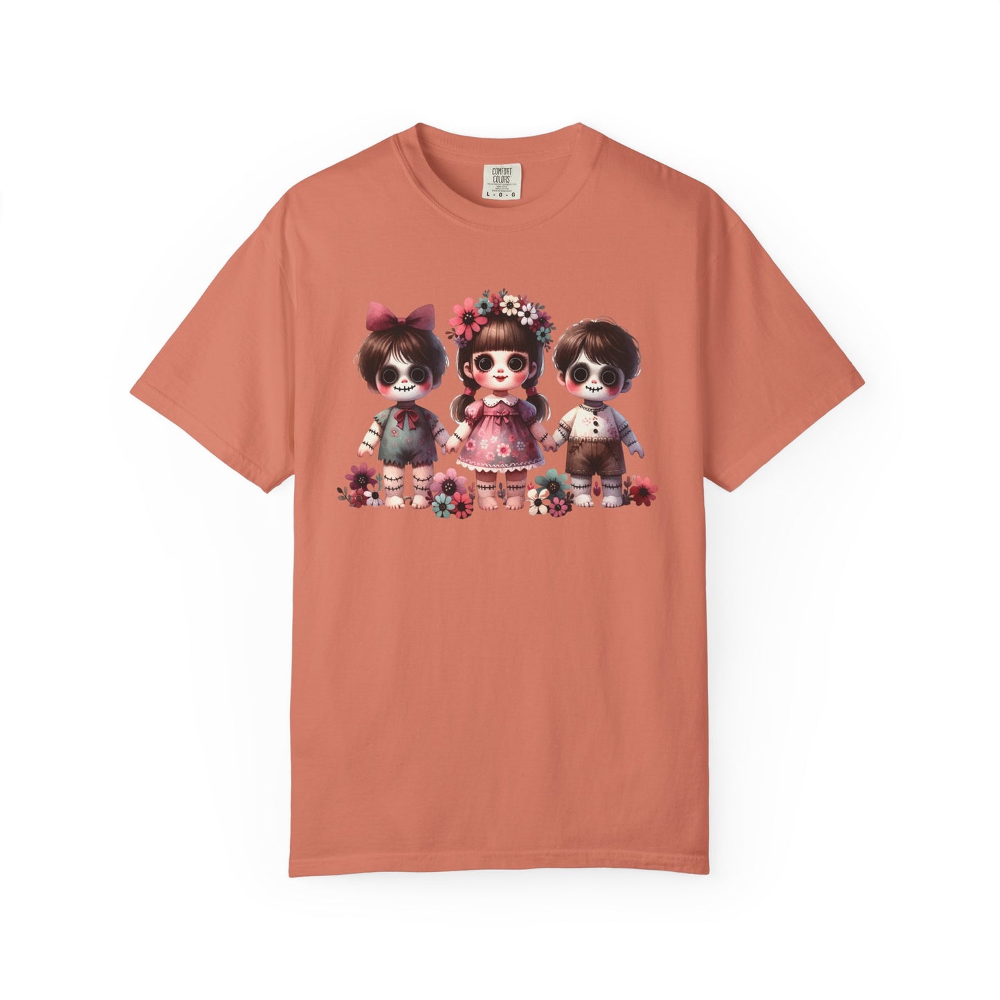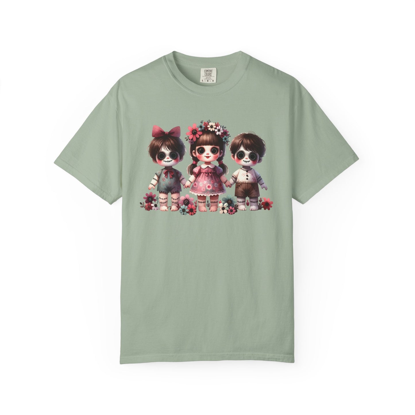 Creepy meets cute in the most stylish way 🖤🌸 This Comfort Colors tee features an original spooky doll trio design—three wide-eyed stitched dolls with sweet little outfits, bows, and floral crowns. The mix of eerie gothic charm and soft pastel florals makes it the perfect statement piece for anyone who loves “cute but spooky” style.