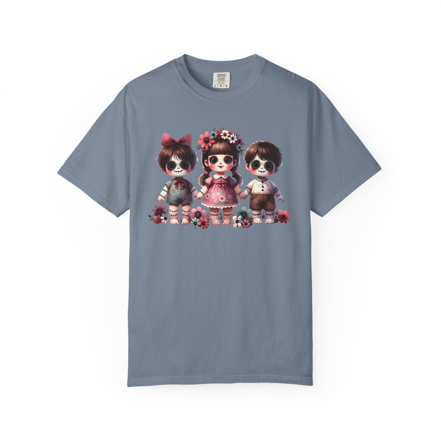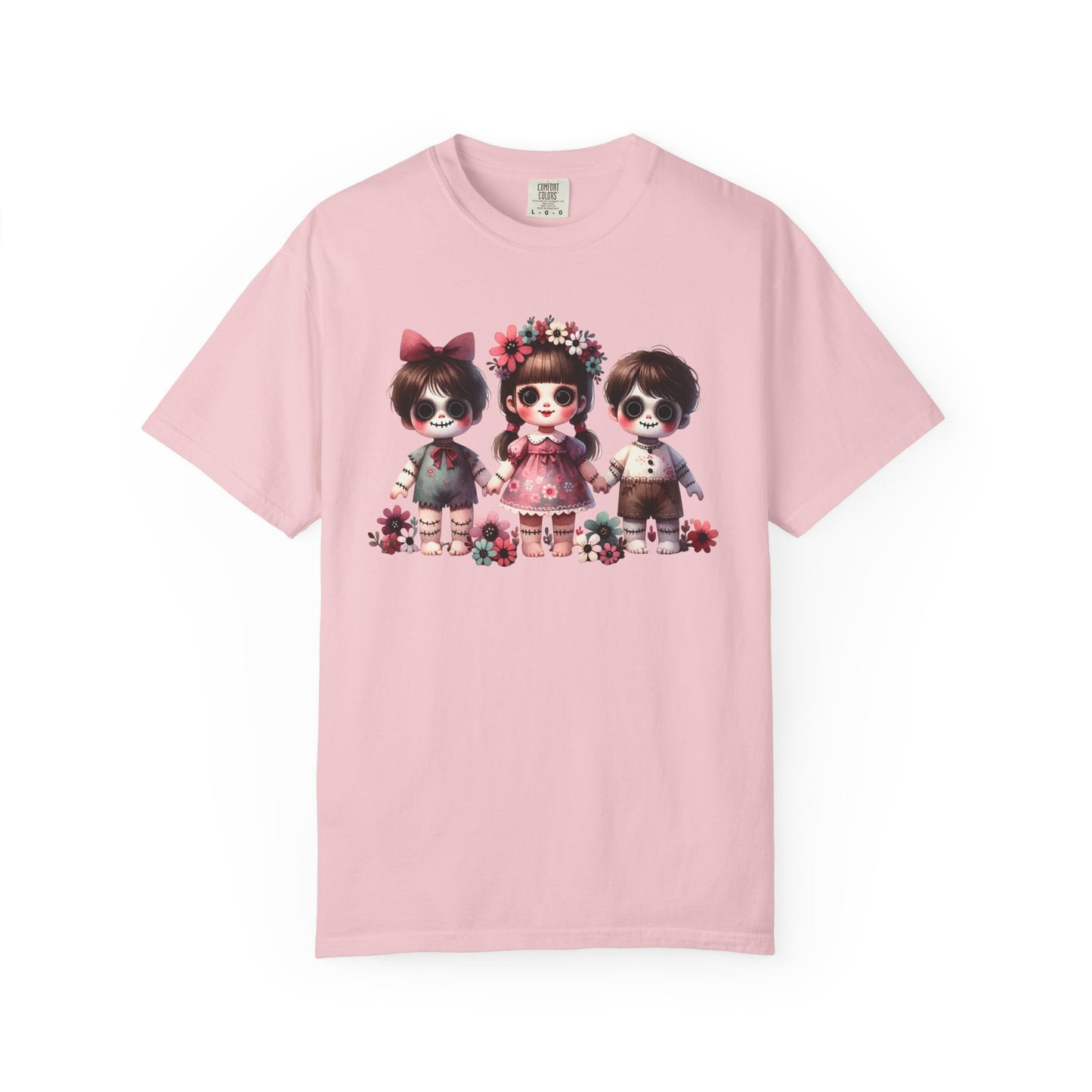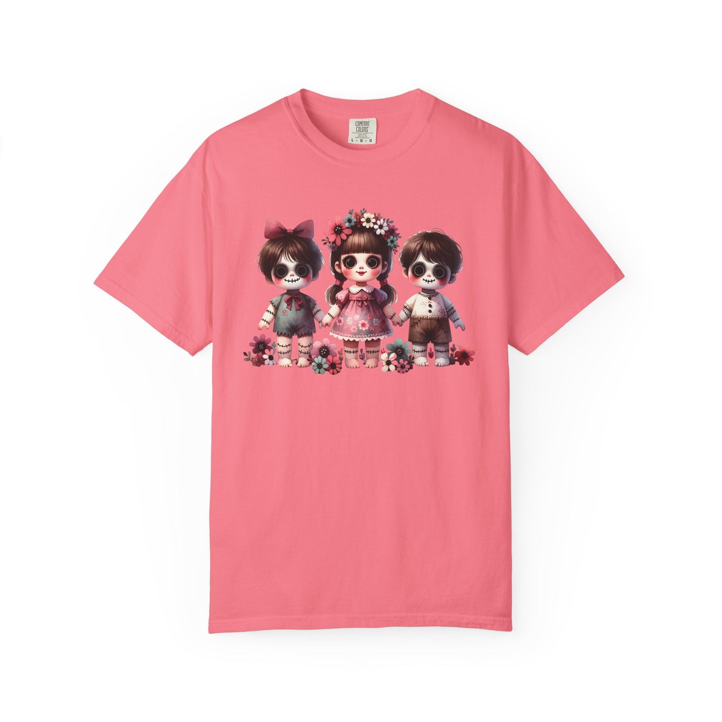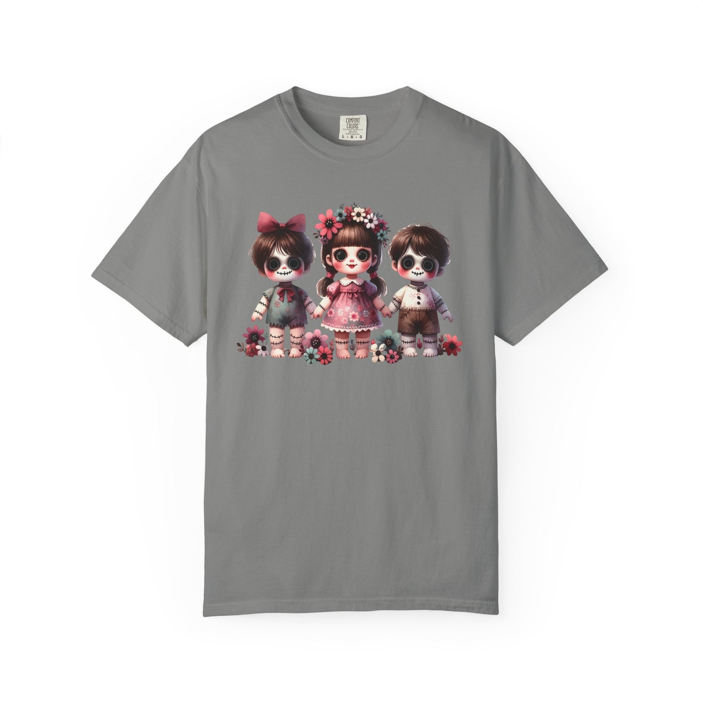 Creepy meets cute in the most stylish way 🖤🌸 This Comfort Colors tee features an original spooky doll trio design—three wide-eyed stitched dolls with sweet little outfits, bows, and floral crowns. The mix of eerie gothic charm and soft pastel florals makes it the perfect statement piece for anyone who loves “cute but spooky” style.