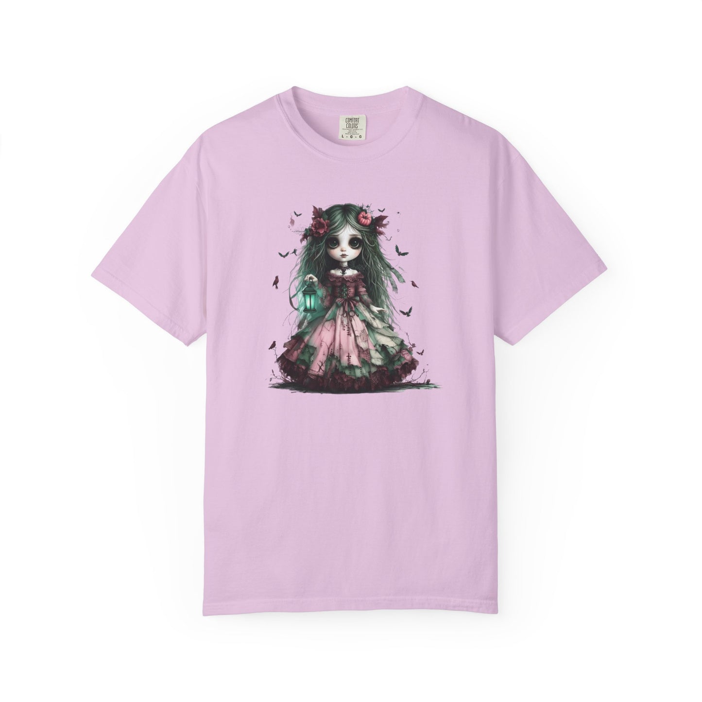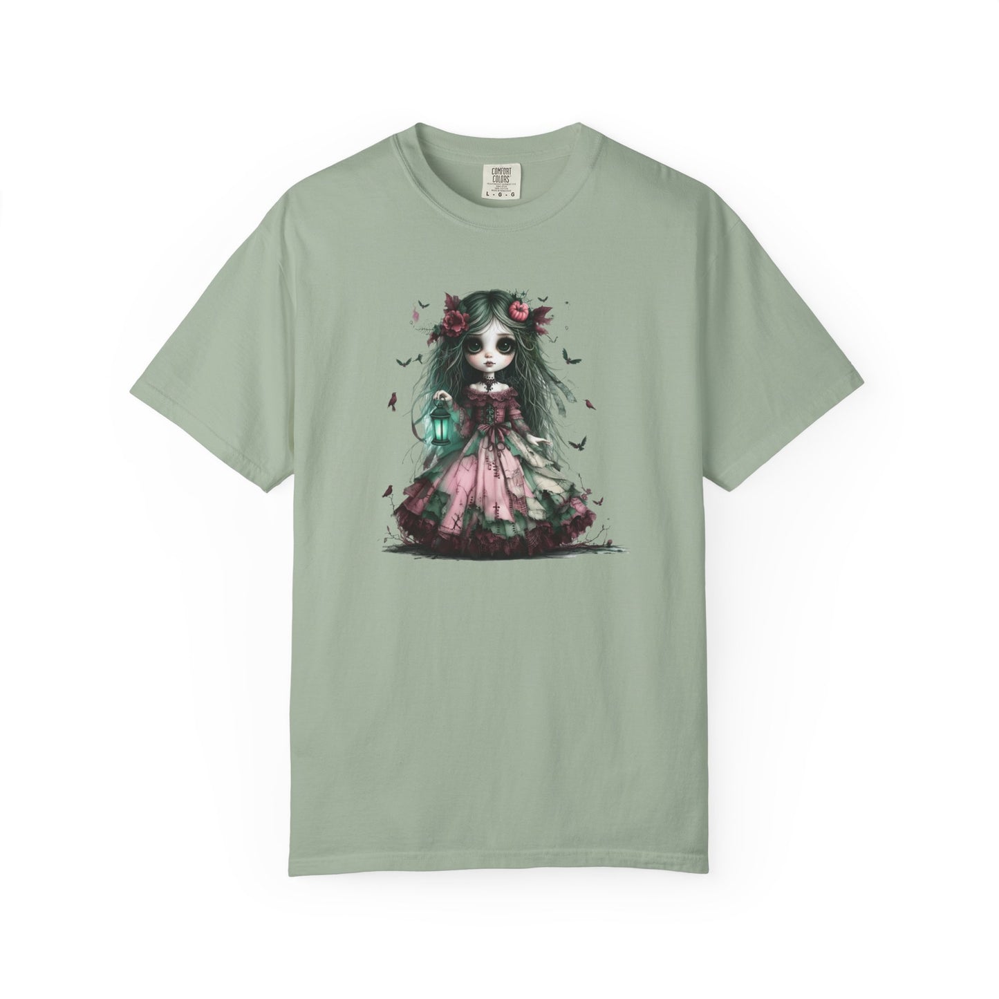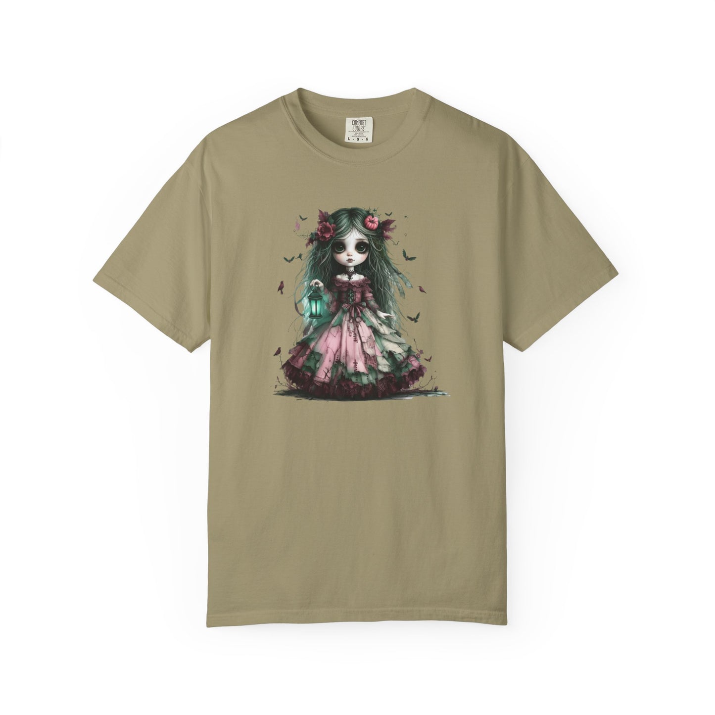 Step into the eerie elegance of gothic whimsy with our Gothic Lantern Girl Comfort Colors 1717 Tee. This hauntingly beautiful artwork features a wide-eyed doll-like figure in a distressed pastel gown, carrying a glowing lantern that feels straight out of a storybook. With a mix of creepy and cute, this tee is perfect for fans of gothic fashion, spooky season vibes, or anyone who loves art that’s a little dark with a soft, romantic twist.