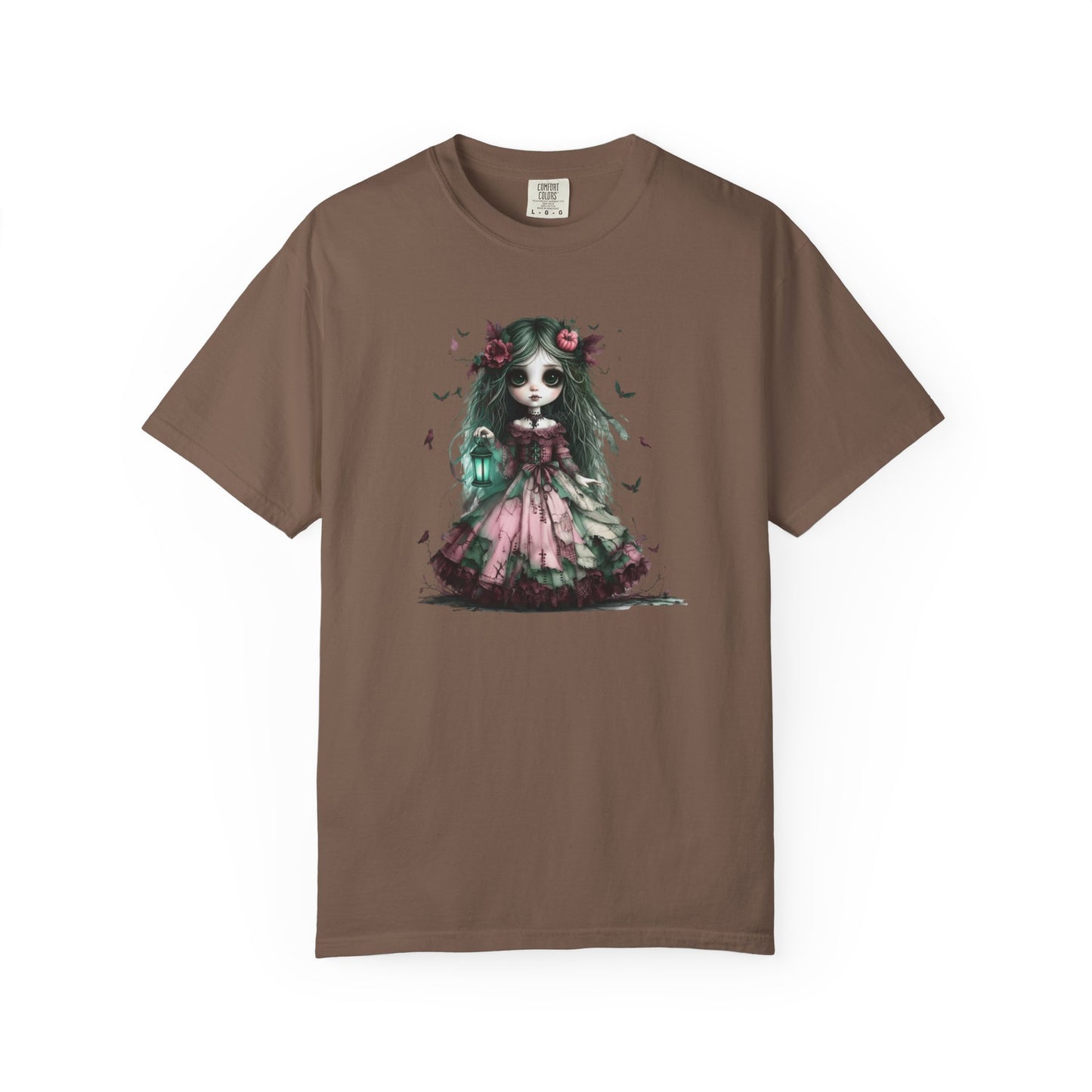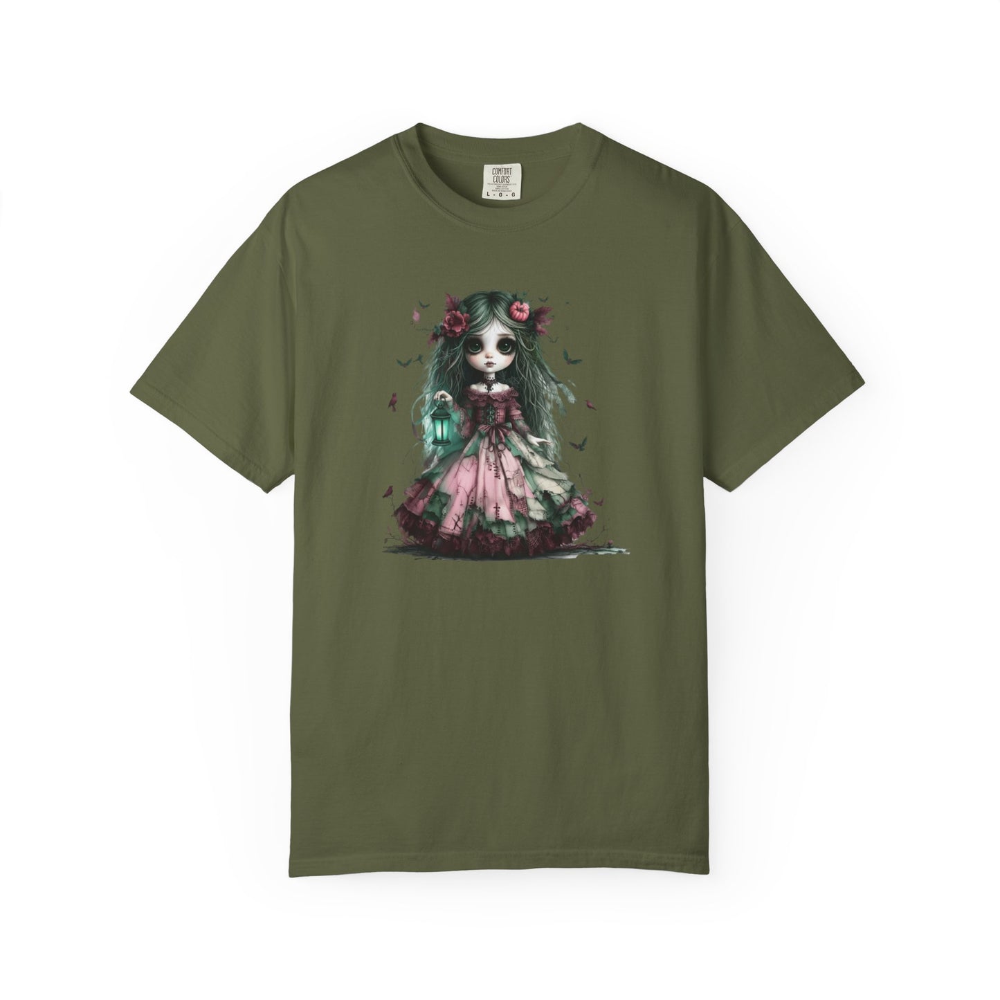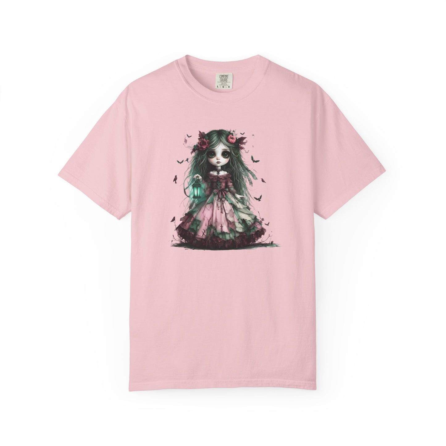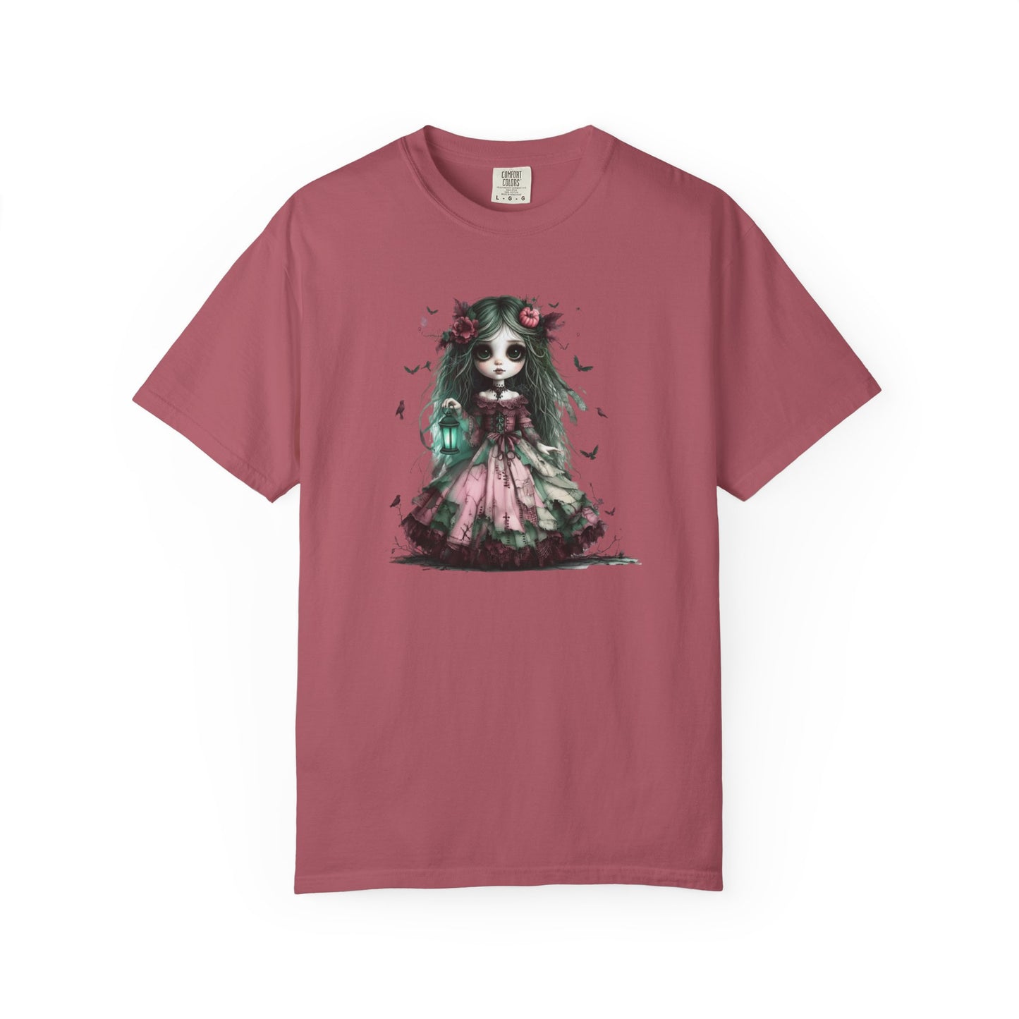 Step into the eerie elegance of gothic whimsy with our Gothic Lantern Girl Comfort Colors 1717 Tee. This hauntingly beautiful artwork features a wide-eyed doll-like figure in a distressed pastel gown, carrying a glowing lantern that feels straight out of a storybook. With a mix of creepy and cute, this tee is perfect for fans of gothic fashion, spooky season vibes, or anyone who loves art that’s a little dark with a soft, romantic twist.
