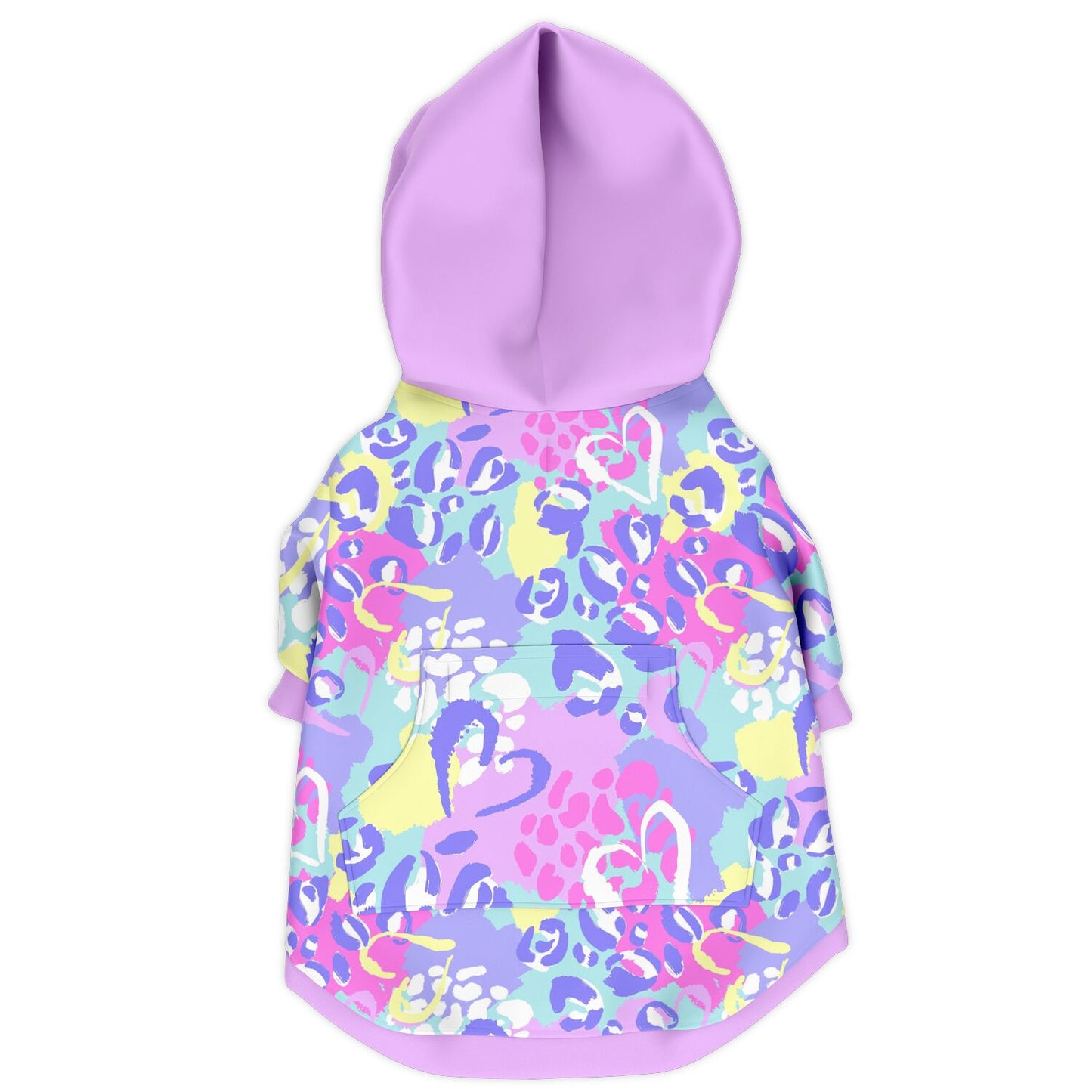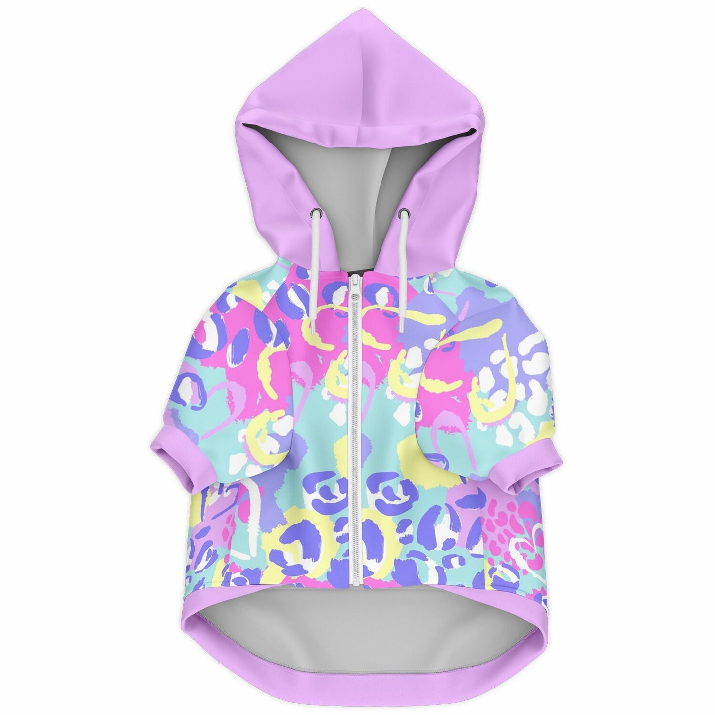 This all-over print zip-up dog hoodie is made from a soft, durable fabric that feels like cotton on the outside and features brushed fleece inside for ultimate warmth and comfort. Lightweight yet snuggly, it’s perfect for everyday outings, brisk walks, or couch-side lounging.Designed with mobility in mind, this hoodie allows for easy movement — plus the front zipper makes getting dressed a breeze. A small opening on the upper back makes it harness-friendly, and the velcro pocket is perfect for stashing treats or small essentials while on the go.