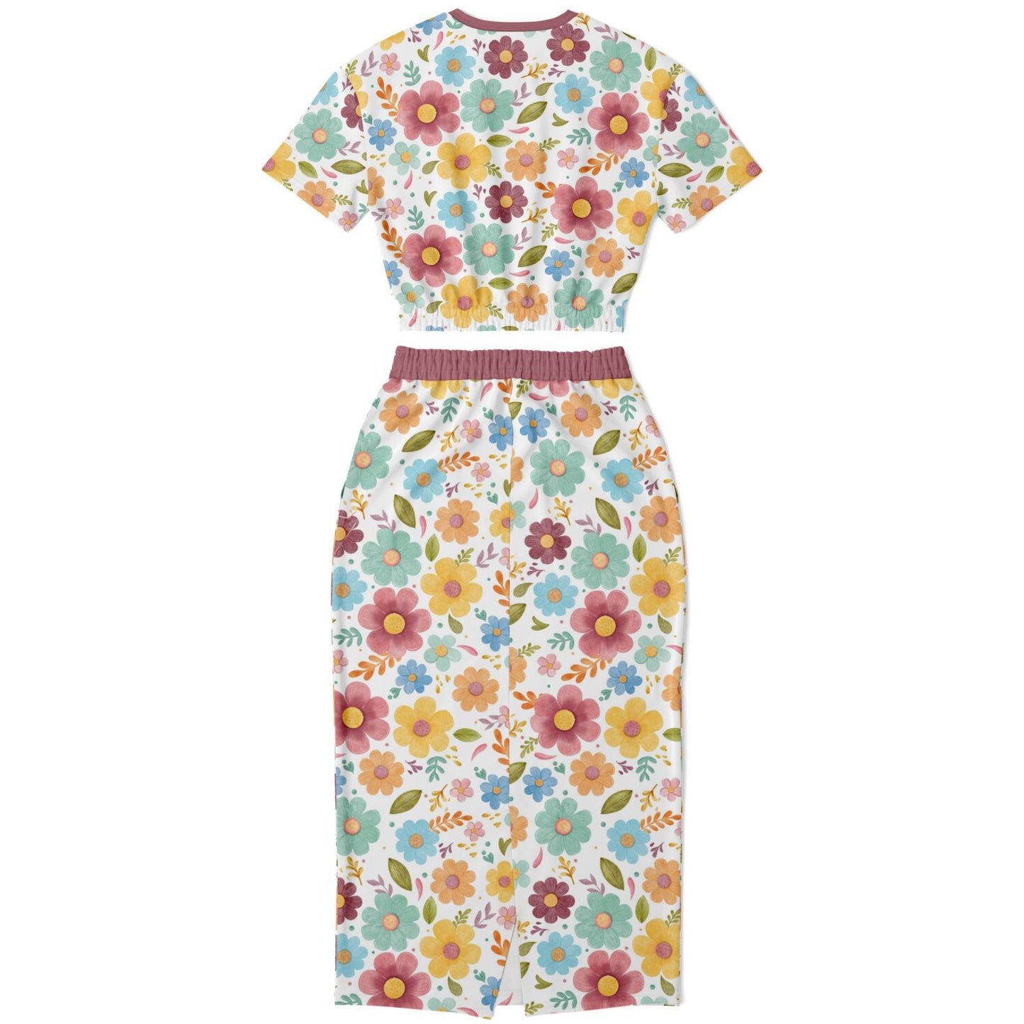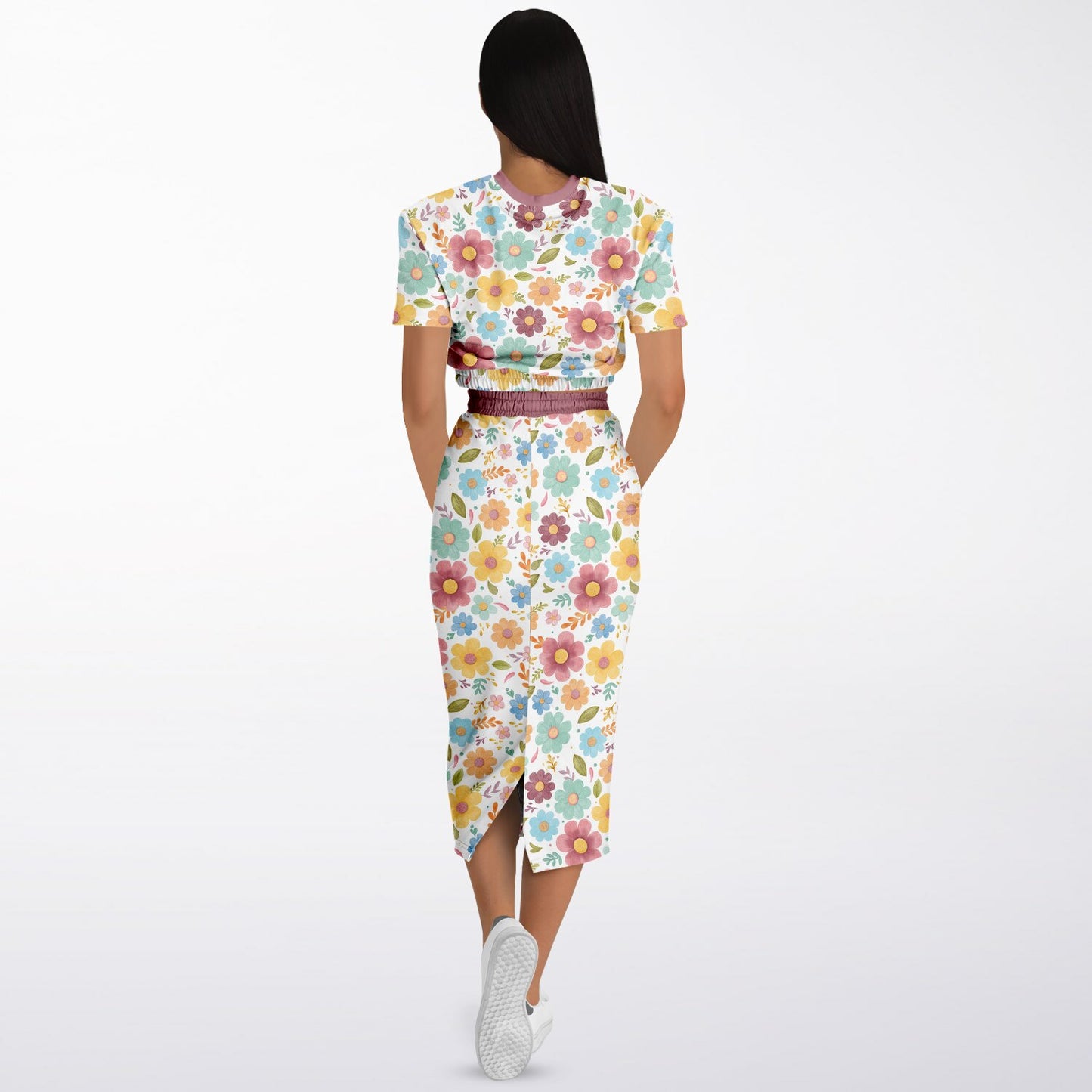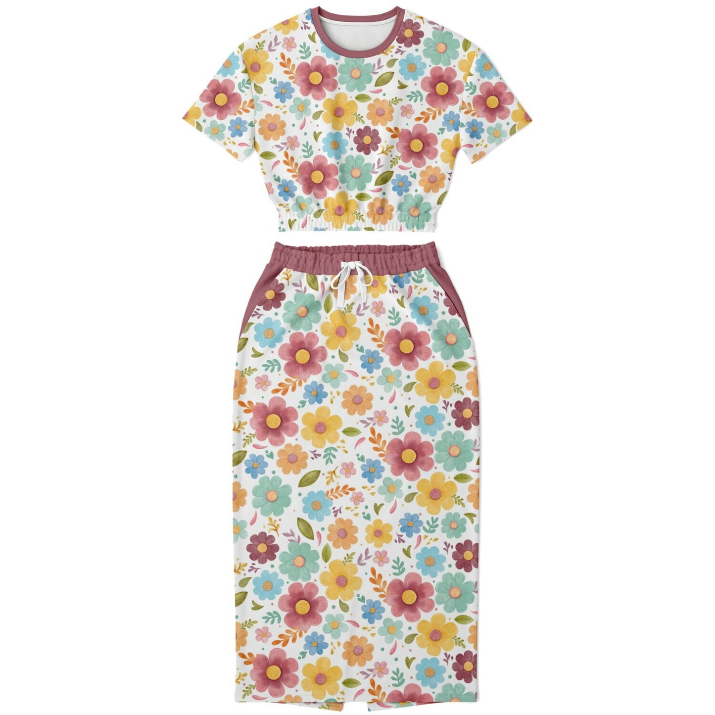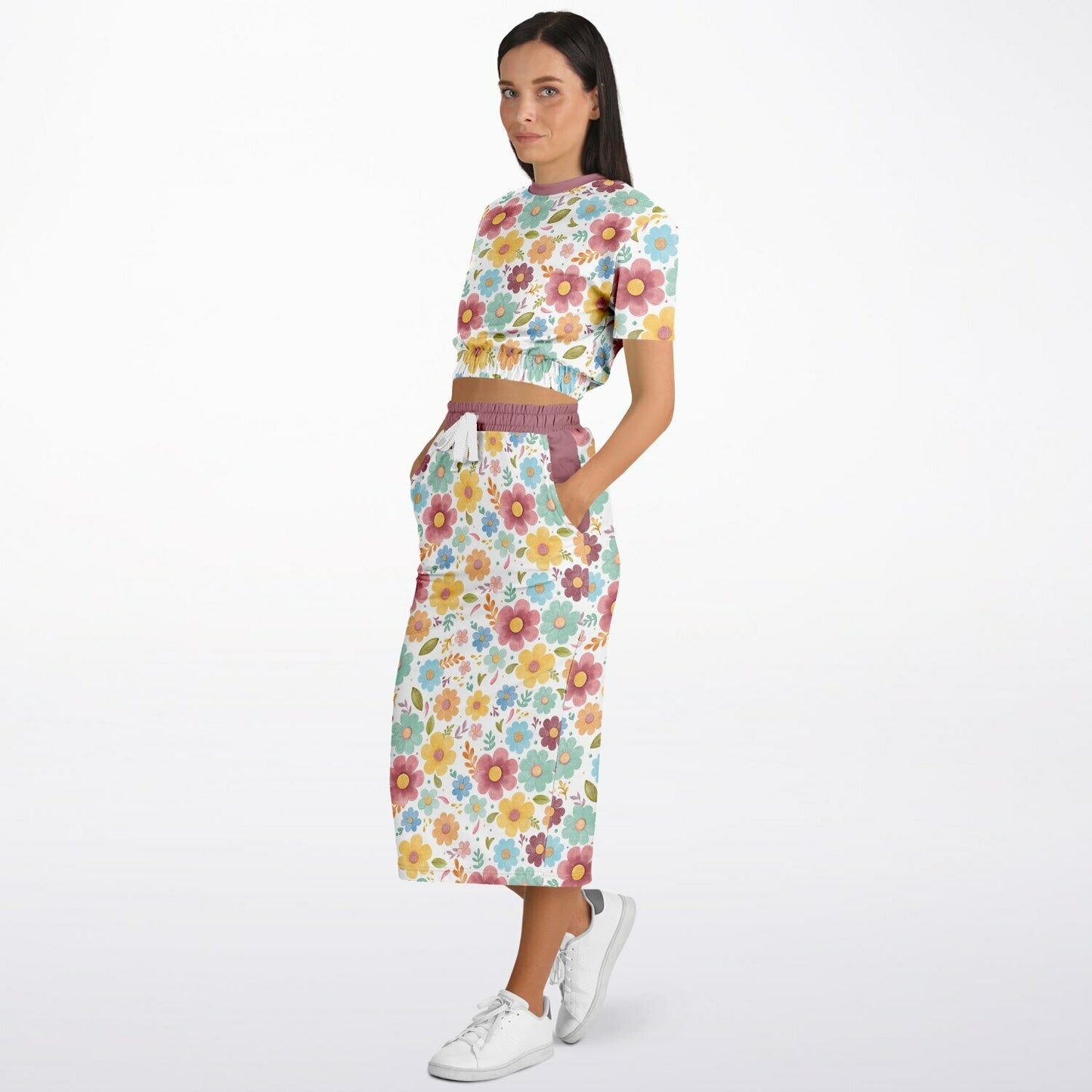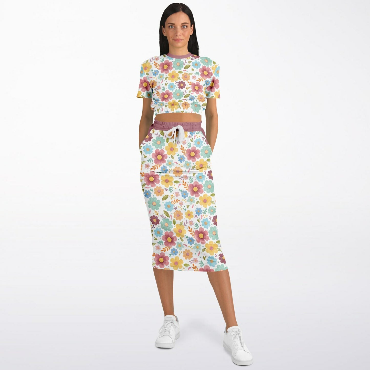 Designed with comfort and versatility in mind, this set is made with a high-quality blend of recycled polyester and spandex fabric. The short sleeve cropped top has an elastic waistband for a comfy, flattering fit, while the high-waisted drawstring midi/maxi skirt hugs in all the right places and even has side pockets. Made from soft, sporty fabric, this outfit is as cozy as it is eye-catching.