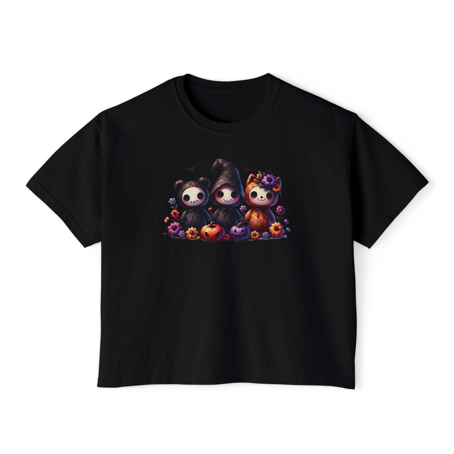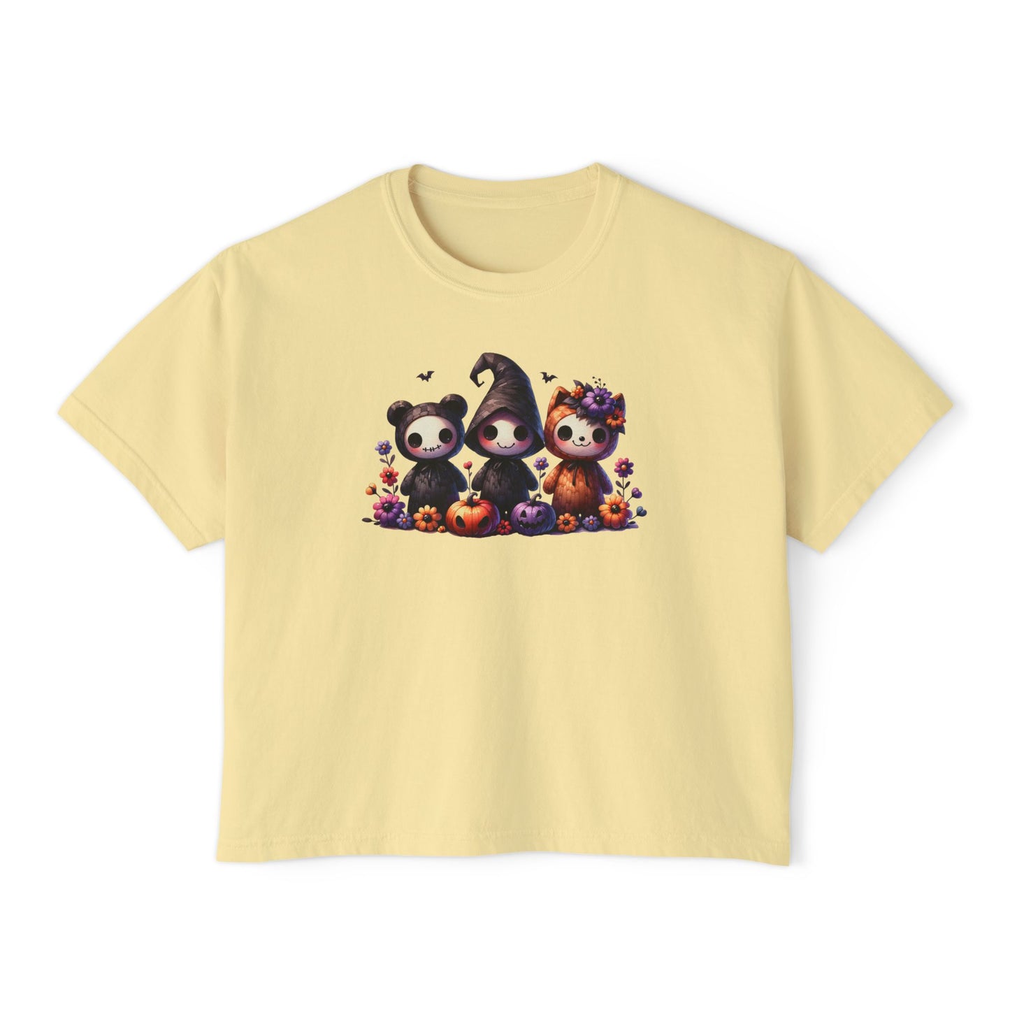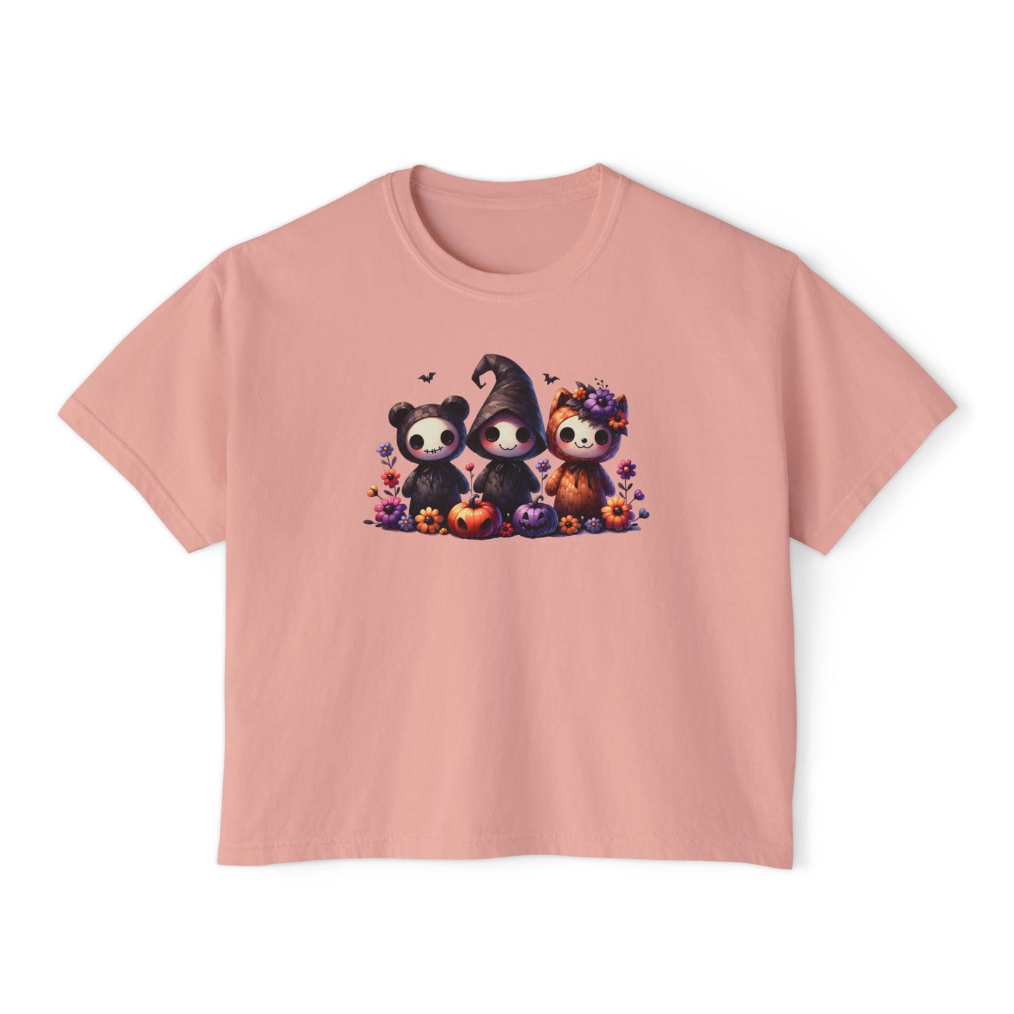 Sweetly spooky and effortlessly stylish 🖤🎃🌸 This Comfort Colors Boxy Tee features the “Spooky Stuffed Animals” design — three adorable plush characters dressed in bear, witch, and cat costumes, surrounded by pumpkins, bats, and pastel florals. A perfect balance of creepy and cute, this tee is made for anyone who loves showing off their spooky side with a soft, playful twist.